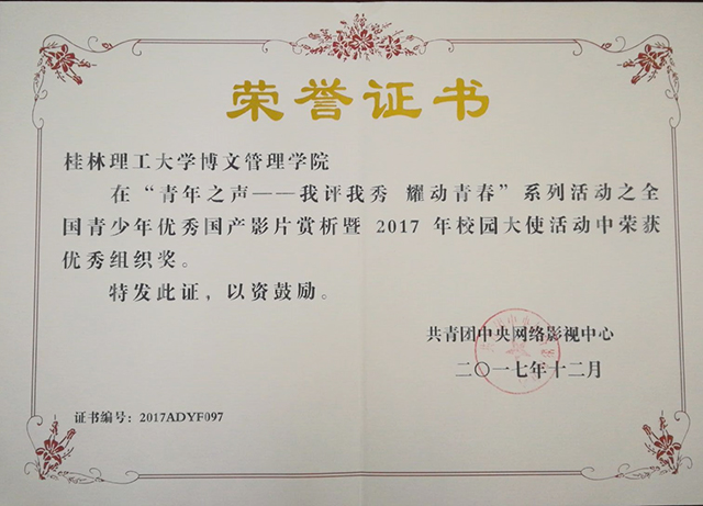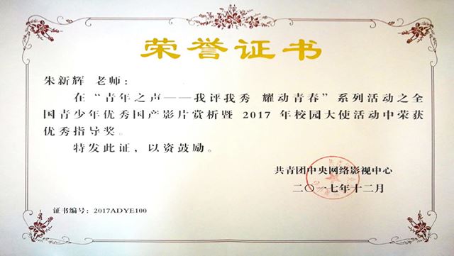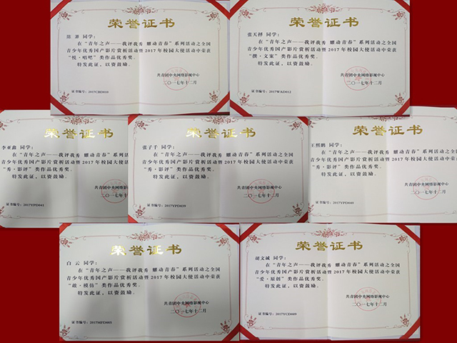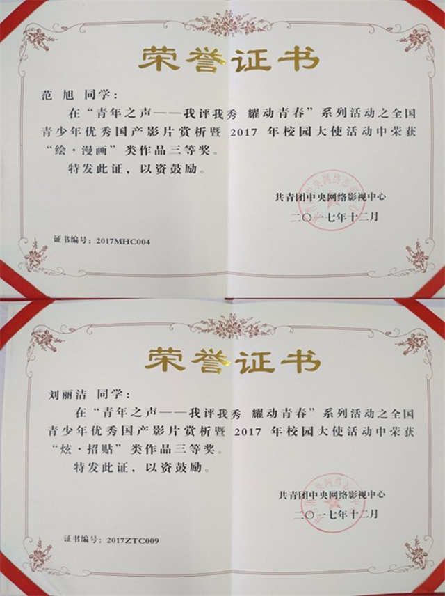 为传承和弘扬中华民族历史文化,让优秀国产电影增强民族自信心,共青团中央网络影视中心在全国范围内开展2017年全国青少年优秀国产影片赏析活动。我校积极组织学生参加比赛,共投稿影评、“绘·漫画”和“炫·招贴”等作品100余件,最终范旭、刘丽洁2名同学荣获“三等奖”,陈源、白云、张文择等7名同学荣获“优秀奖”,老师荣获“优秀指导奖”,同时学校获得“优秀组织奖”。
