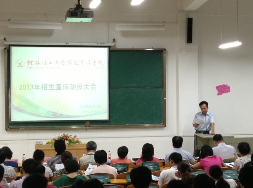 大会第一项,主管招生工作副院长杨乾尧首先为大会做了今年招生宣传工作的总体部署。他强调本次大会的目的在于让全校师生了解招生工作的重要意义,了解招生宣传的技巧,加大下一阶段的招生宣传力度,努力达成2013年的招生工作目标。他借鉴各类学校的招生工作经验并结合我院实际,对今年的招生工作作出明确部署。他指出,招生工作不是“招生办的事”,它是“校长工程”,应举全校之力做好招生工作。创造性地提出了“山水甲桂林,成才在博文”的招生宣传口号。最后从学院的办学定位、资源优势和办学特色三个方面详细阐述了我院今年招生宣传的核心内容。