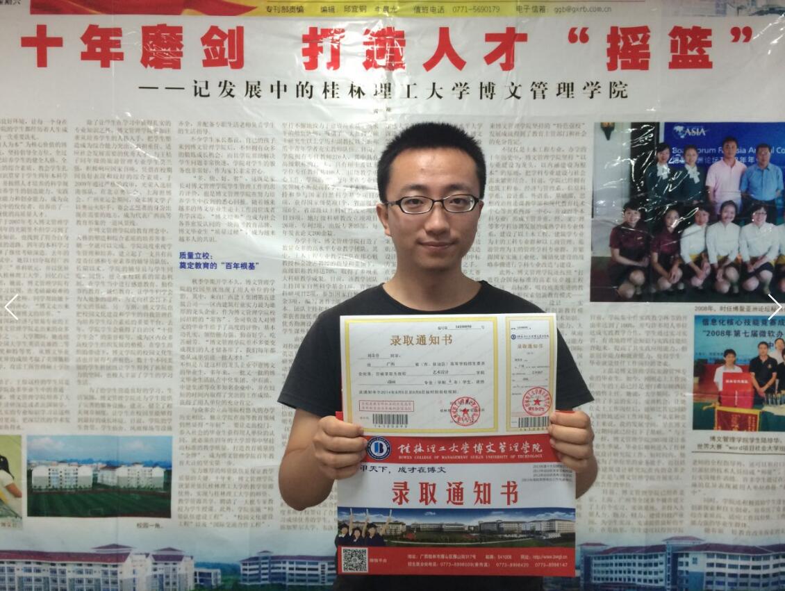 喜讯:我校2014年首批录取通知书正式发放 2014年7月25日,我校广西、江苏、河南艺术提前批录取工作顺利结束,首批录取通知书以特快专递形式成功邮寄。广西艺术考生刘奇非同学荣幸成为我校2014年录取的第一位新生。 为提高新生服务质量,为新生快捷便利办理入学手续,我校今年创新推出新生“实时录取查询”与“网上自助选床位”系统,新生可随时登录桂林理工大学博文管理学院招生信息网(http://zj.bwgl.cn/zs/)“招生录取查询”界面实时查询,实时跟踪您的录取通知书邮寄到达情况。 以上如有疑问请拨打招生办咨询热线:0773—8998009,8998088,8998018。 广大考生可关注我校招生办新浪官方微博:(http://weibo.com/u/3901317523)与我校官方微信公众平台实时互动并参与分享。 |