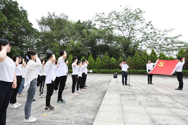 在巍峨的烈士纪念碑前,面对着鲜红党旗,全体党员举起右拳,郑重宣誓,共同重温入党誓词,表达“不忘初心、牢记使命”的坚定政治信念。