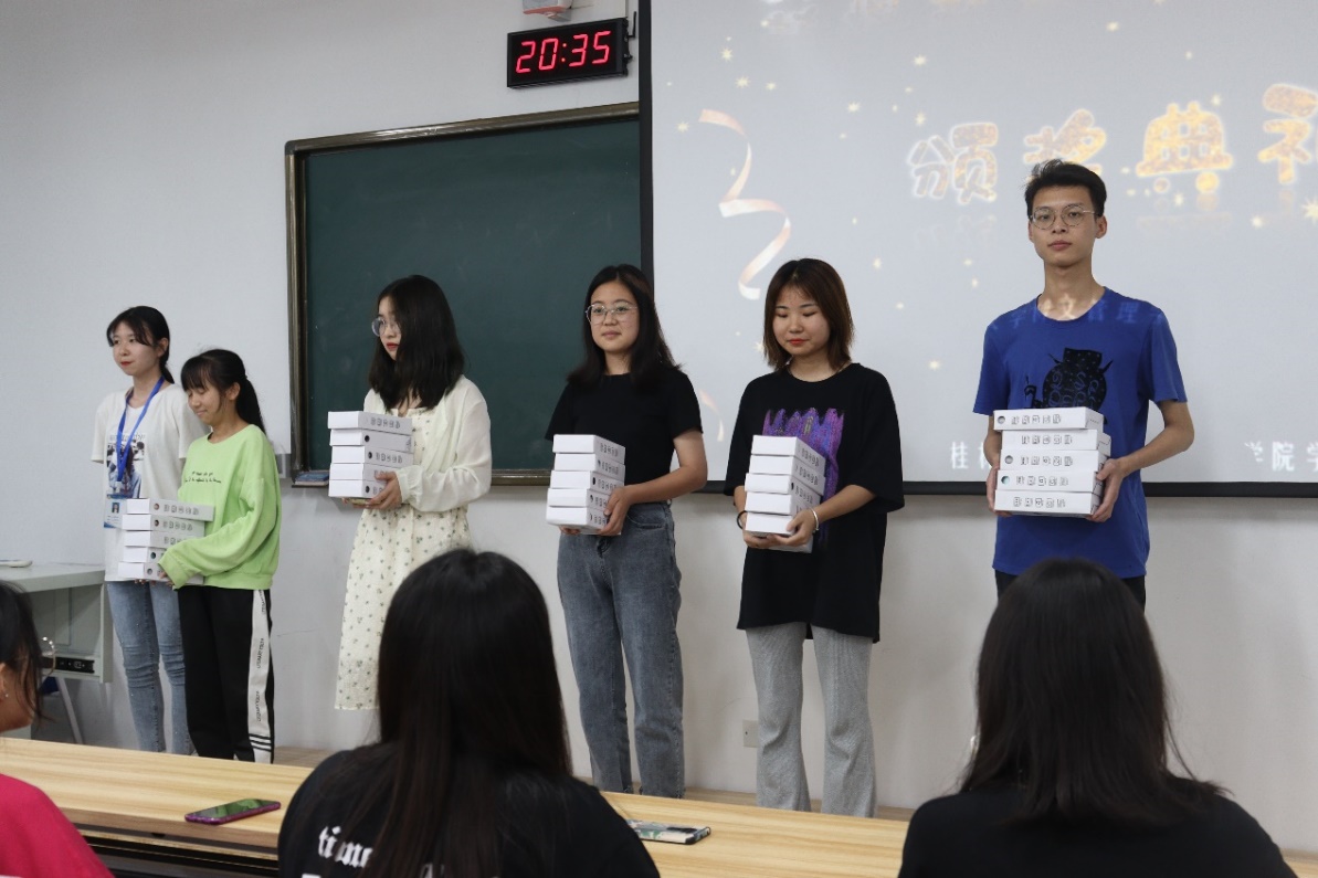 宿管委办公室临时负责人胡玉娇、宿管委宣传部临时负责人邵林浩为第一名至第五名宿舍代表颁奖,他们分别是G9-302宿舍、G10-437宿舍、G9-517宿舍、G9-601宿舍、G10-312宿舍。