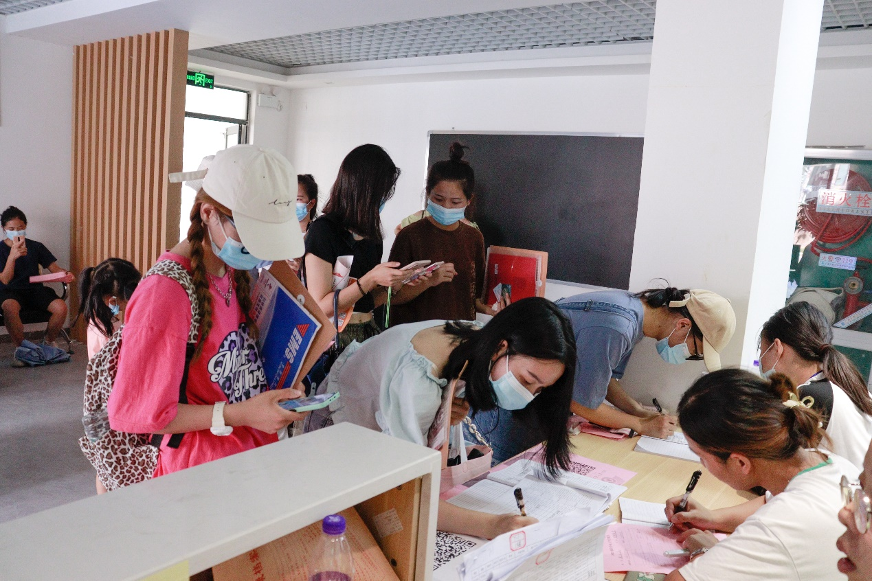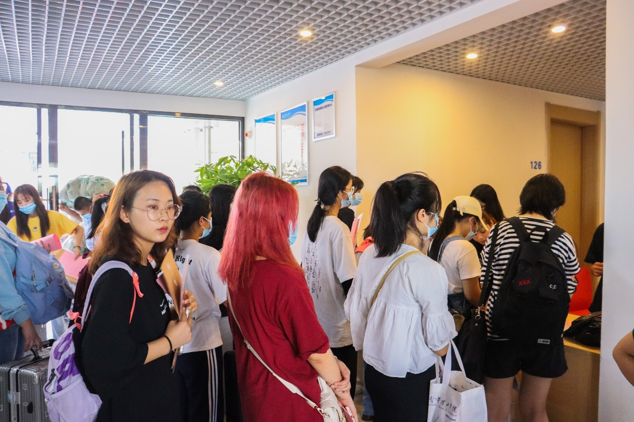 值班期间,新生们自觉有序排队,配合宿舍管理员及值班人员进行入住信息填写,等待领取宿舍钥匙,入住公寓。