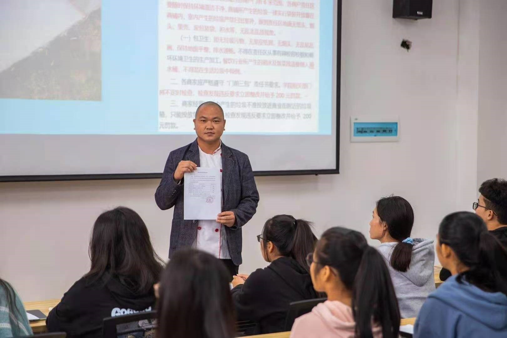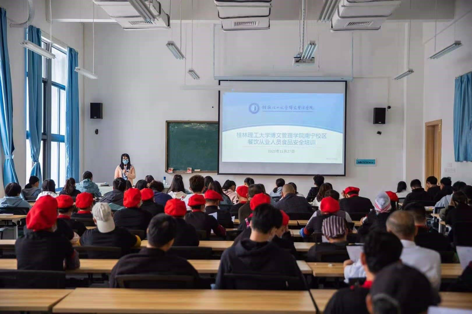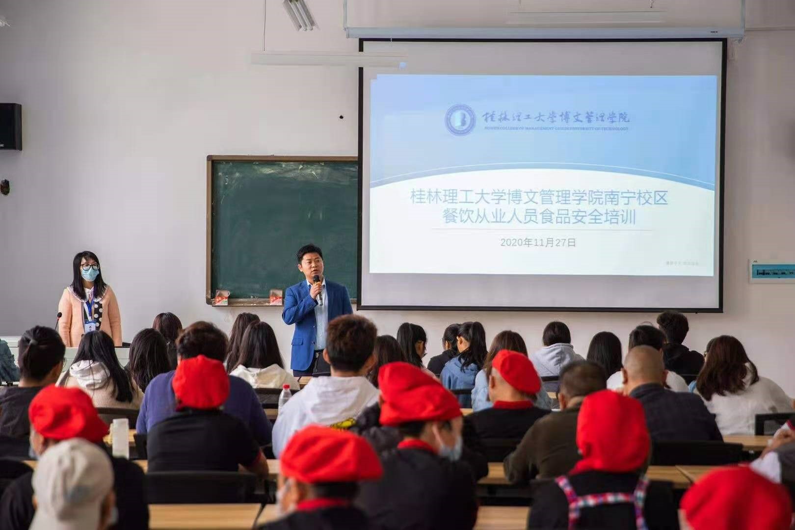 为落实《食品安全监督管理办法》和《高校食堂监督管理办法》,推行“明厨亮社”和 “色标管理”,提高学校食堂的伙食质量和服务水平,确保师生的饮食健康与安全。11月27日,后勤保障部组织召开食品安全卫生培训会,南宁校区食堂从业人员和膳食管委会学生参加培训。培训会由老师主持。