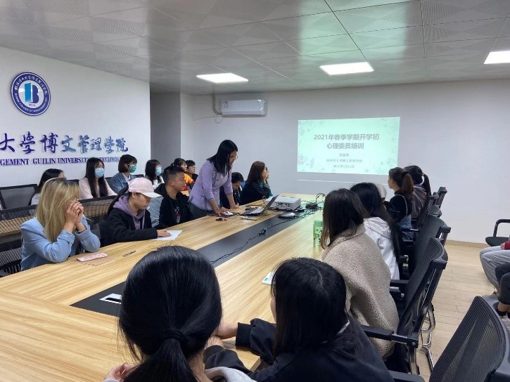 为提高学生的心理健康品质,发挥学生在心理健康教育工作中的主体作用,近日,学生事务部组织开展2021年春季学期开学初心理委员培训。培训由心理咨询员覃丽珠主讲,校区全体心理委员参加培训。