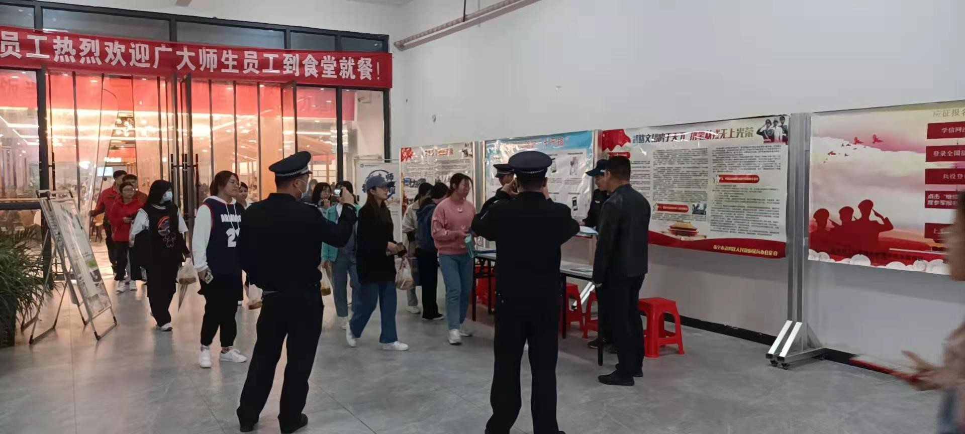 首先,后勤保障部和特邀警官在食堂门口发放防诈骗宣传资料,特邀警官同时解答学生关于电信诈骗的相关问题。