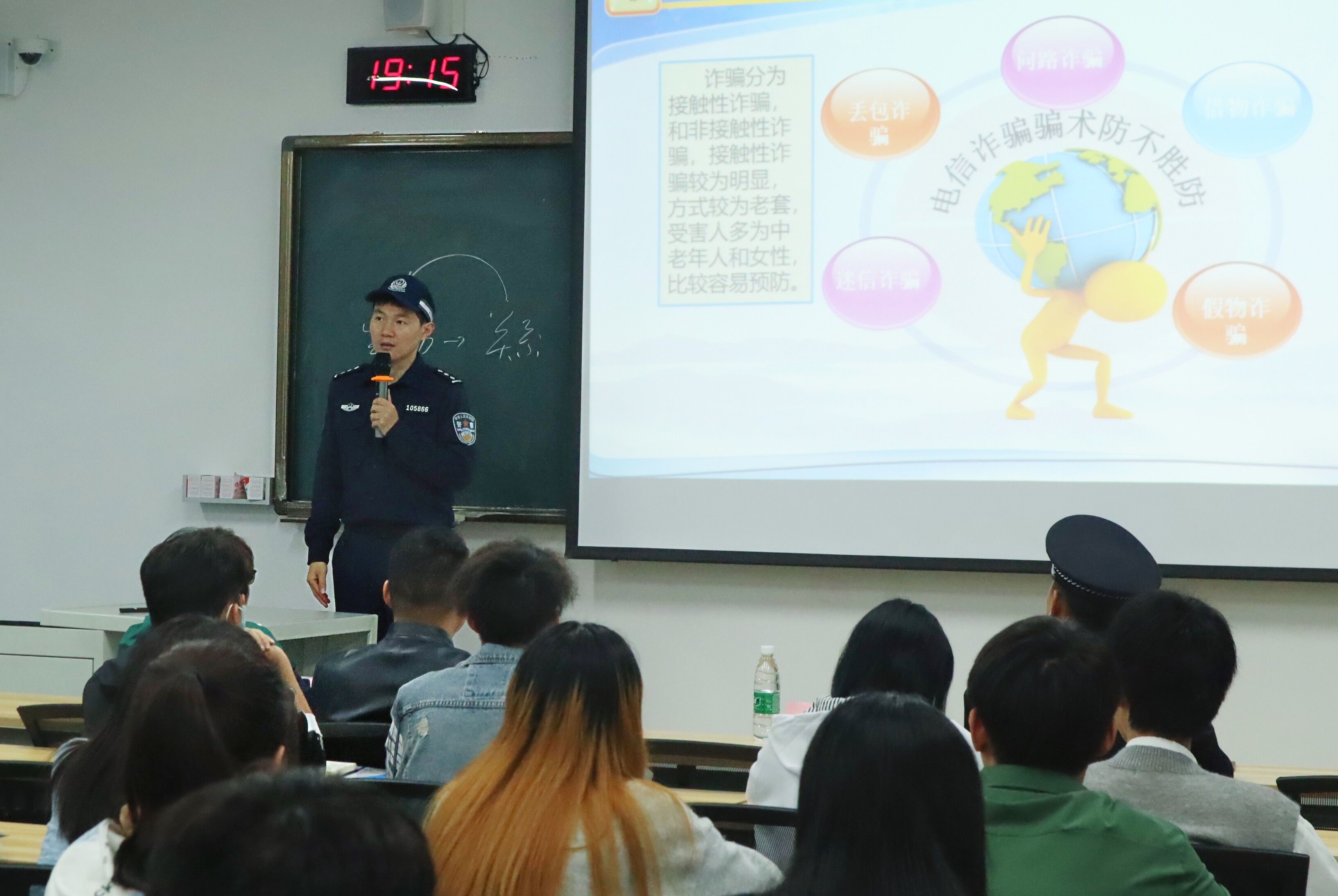 为了广泛宣传防范电信诈骗,提高南宁校区师生电信诈骗的识别能力和安全防范意识,3月25日,南宁校区举行防诈骗安全教育活动。活动分为现场发放防诈骗宣传资料和防诈骗安全知识讲座两部分,邀请了南宁市公安局里建派出所李元生、毛兴江等4名警官进行防诈骗宣传。后勤保障部副主任、分团委书记、学生事务部老师、后勤保障部干事和95名学生出席讲座现场。