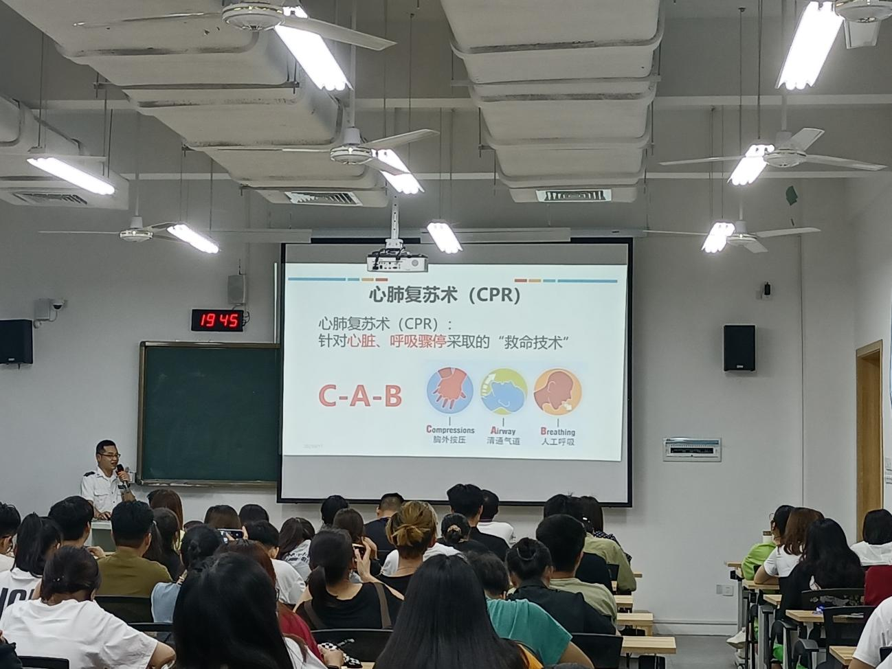 陆盛勤医生从普通人为何要学习心肺复苏术切入,深入浅出地讲解了心肺复苏术的流程和要点,通过理论加现场模拟的方式再现了医护人员抢救病人时的情景,加深了师生们对心肺复苏术的印象。