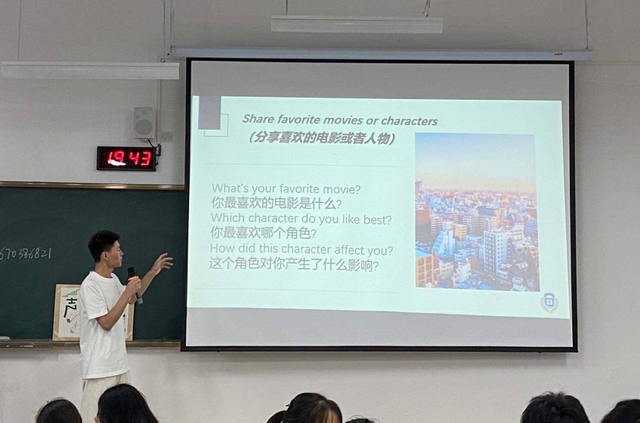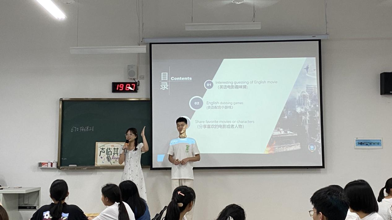 活动在两位主持人幽默的对话中正式开始,活动共分为三个环节,第一个环节“英语电影趣味猜”,根据播放的电影片段猜出电影的名字,每一段电影片段后,同学们都积极踊跃地抢答;第二个环节“声临其境”,每个小组自选一段电影配音,参与配音的选手将电影片段演绎得淋漓尽致,赢得观众阵阵的掌声;第三个环节是“分享喜欢的电影或者人物”,在前两个环节的铺垫下,同学们都一改初识的拘束,敞开心扉交流起来。整场活动趣味无穷。