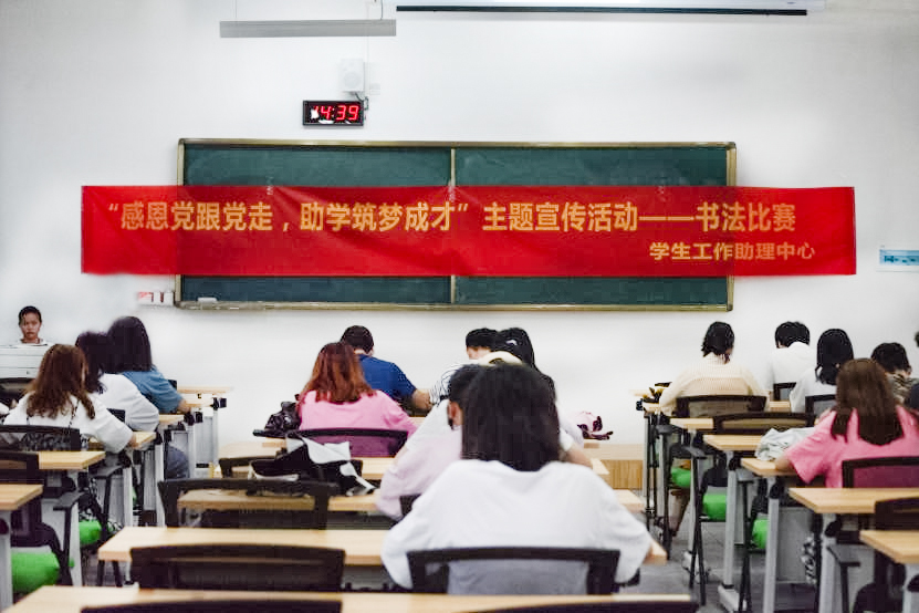 为庆祝建党100周年,培育受资助学生的爱党爱国情感和感恩意识,进一步推进南宁校区学生资助政策宣传工作,南宁校区学生事务部于2021年5月22日下午在A4教学楼举办了资助政策宣传月“感恩党跟党走,助学筑梦成才”主题宣传活动—书法比赛,本次活动由南宁校区学生工作助理中心承办,共有六百多名同学参与。