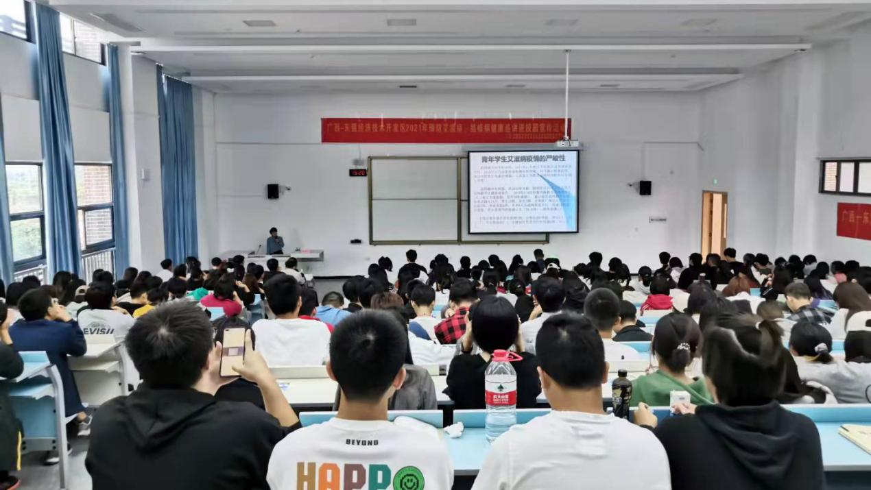 10月19日下午,东盟校区邀请东盟经开区里建社区卫生服务中心主任兼南宁市第十人民医院公共卫生科科长陆爱华同志到教学楼A3217为校区师生开展预防艾滋病和新冠肺炎知识讲座。