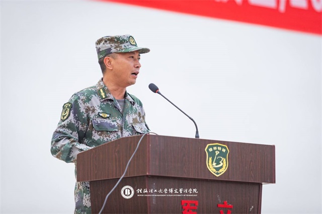 副校长王加青向军训团授旗后,党委书记金飞做出军训动员讲话,并宣布军训正式开始。金飞书记为大家提出三点建议:第一,全体承训官兵、带训干部和参训学生要提高认识,在军训工作中通力合作,有效沟通,加强协调;第二,全体带训干部要严格要求自己,起好模范带头作用;第三,希望全体参训同学要以饱满的热情和高昂的斗志投入训练,自觉地将军训基地当军营。