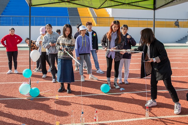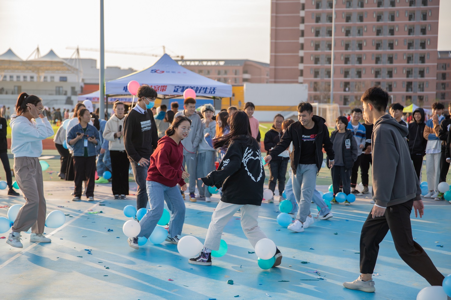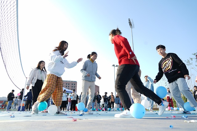 游戏进行得如火如荼,现场气氛活泼热烈,各小组展开激烈角逐、团队配合亲密无间,场地边观看的师生纷纷呐喊加油。