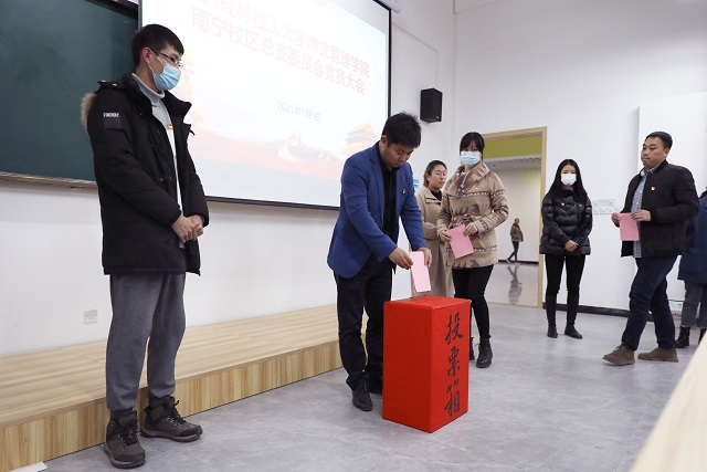 大会在庄严的国歌中拉开了帷幕。会议表决通过了《中共桂林理工大学博文管理学院南宁校区总支委员会党员大会选举办法》和总监票人、监票人、总计票人、计票人名单。随后,同志介绍了南宁校区党总支第一届委员候选人预备人选情况,会议以无记名投票差额选举的方式选举产生了第一届总支委员(以姓氏笔画排序):、、、、、、。