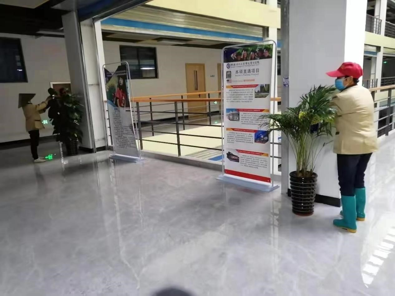 根据会议安排,各中心就疫情防控、食品安全、水电隐患排查、校园环境卫生等方面开展各项服务保障工作。商业中心、公寓中心、物业中心全体职工对学校食堂、学生公寓、教学楼、公共楼宇、校园环境进行全面清扫和卫生保洁。