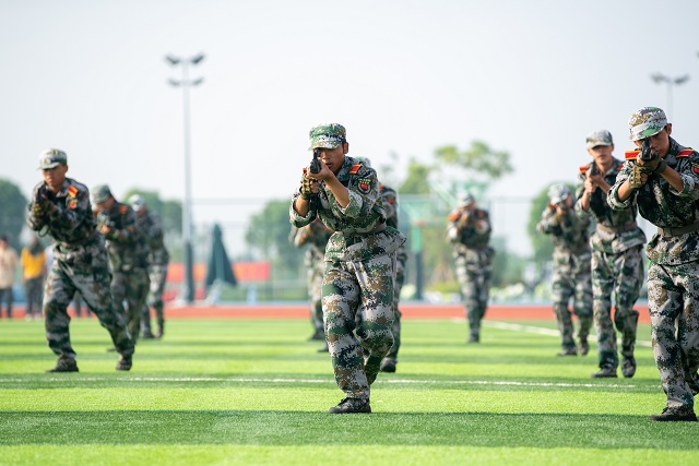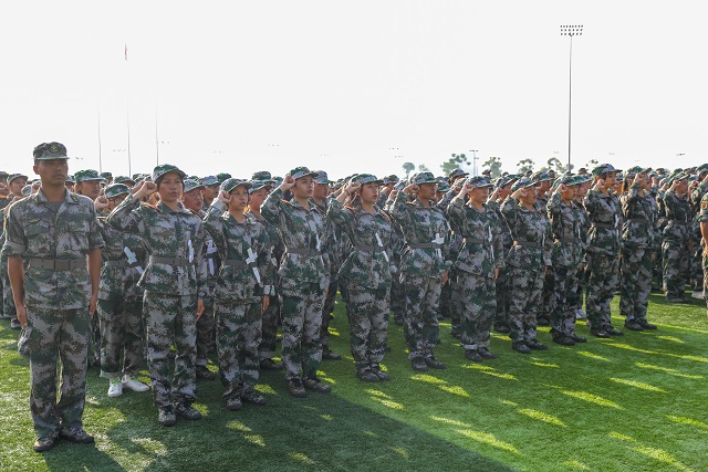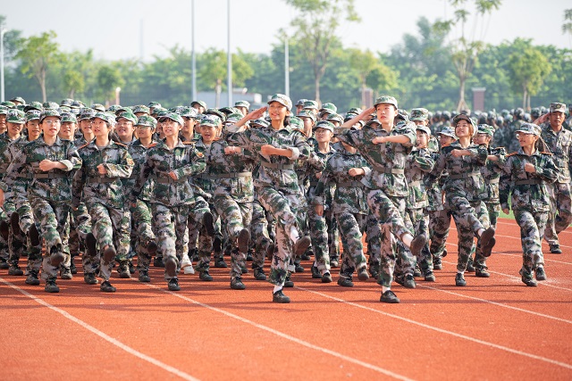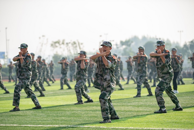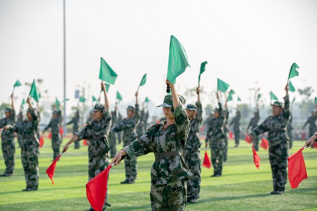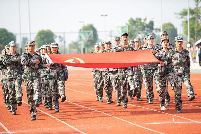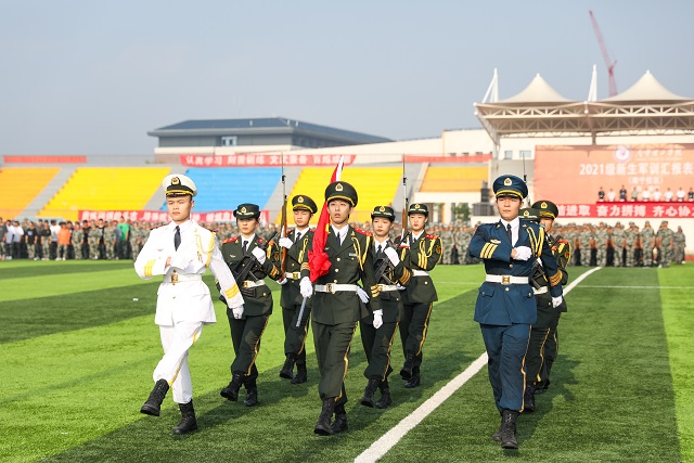 在激昂的《中国人民解放军进行曲》伴奏下,2021级全体受阅方阵精神抖擞,步伐铿锵有力,喊着嘹亮的口号走过检阅台。经过14天的历练,参训学生挺拔的军姿和整齐的队列,展现了昂扬的斗志和蓬勃的活力。