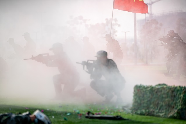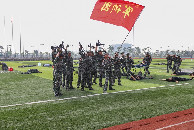 分列式结束后,拳术、旗语、内务、战术、匕首及文化方队依次进行汇报表演。“请党放心,强国有我!”一声更比一声高,同学们在汇演最后表达了对党的无限热爱和担当中华民族伟大复兴重任的坚强决心。