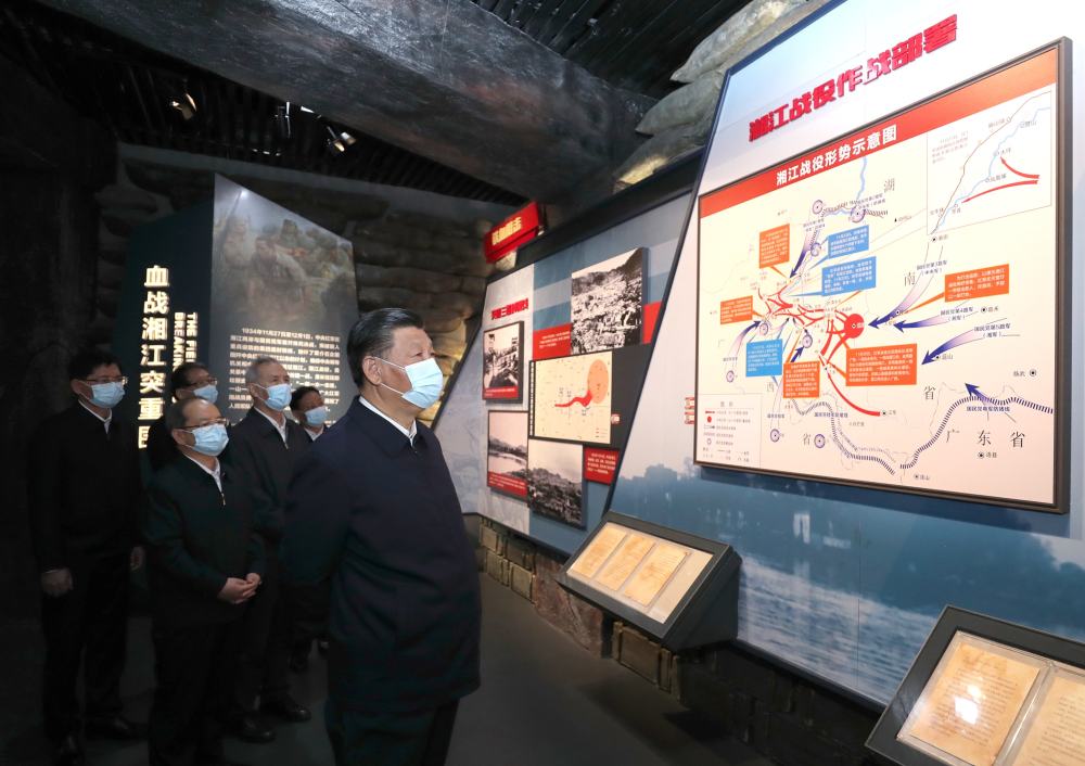 ↑2020年9月16日,习近平在湖南郴州市汝城县文明瑶族乡沙洲瑶族村“半条被子的温暖”专题陈列馆,