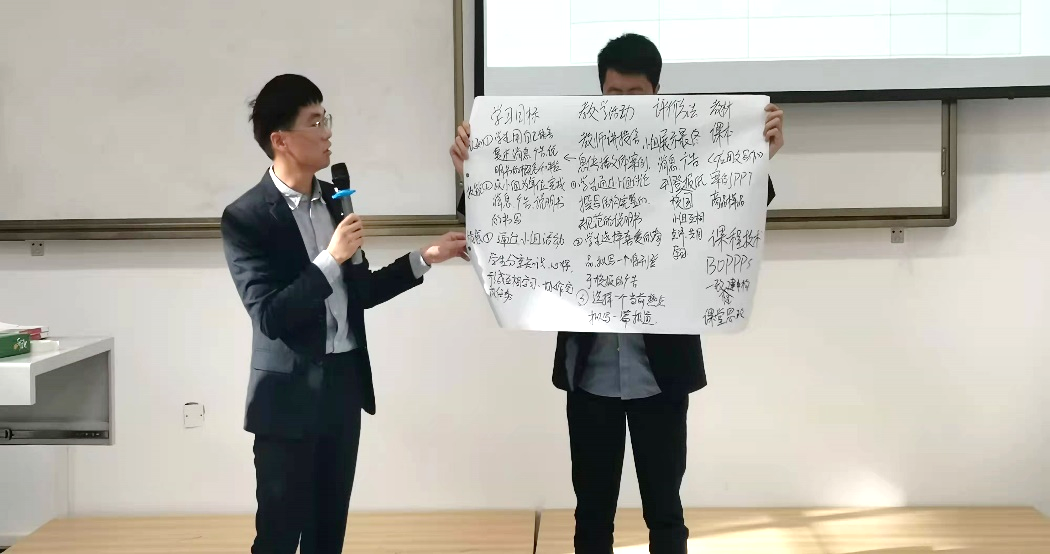 随后,培训组学员分为六个组,根据主题内容从课程活动、课程技术、学习评测、教学材料、教学大纲、教学进度、教材选择、课程设计等多个维度进行课程设计,并进行成果展示。
