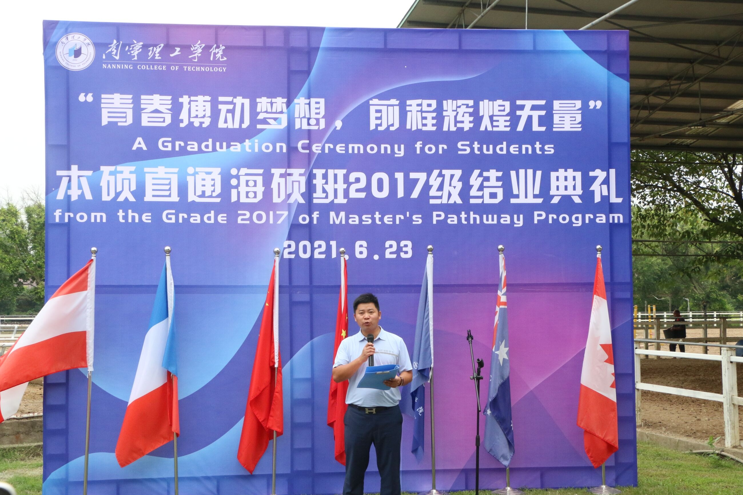 拥抱世界,相约未来。6月23日上午,国际教育学院在桂林金鞍马术学院为2017级海硕班优秀毕业生举办毕业典礼。校党委副书记邓雪梅,桂林理工大学博文管理学院副校长王加青,国际教育学院院长、学工处处长李枚宴,商学院党总支副书记姚顺良,土木与工程学院党总支副书记梁杰,信息工程学院党总支副书记廖亮,文理学院党总支副书记刘武钢,2017级全体海硕班成员、南宁校区2020级海硕班全体学员参加此次活动。