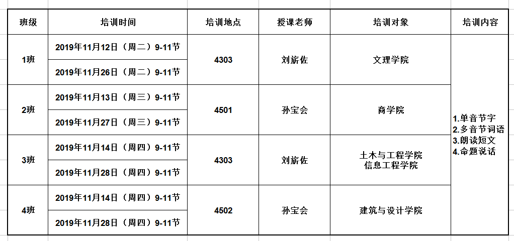 为确保我校2019年下半年计算机辅助普通话水平测试工作的有序开展,使参测考生适应考试方式和取得较好的成绩,继续教育学院安排了考前培训,请已报名计算机辅助普通话水平测试的同学们安排好时间,务必参加培训,届时将发放培训资料、对个人信息进行核对等,具体安排如下: