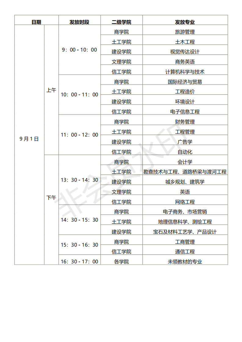 下学期学生教材(含专升本)于2019年9月1日在教一楼书库(1116、1117、1118、1119)发放。本次以专业年级为单位发放,请做好组织工作。具体时间安排如下: