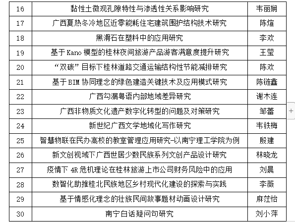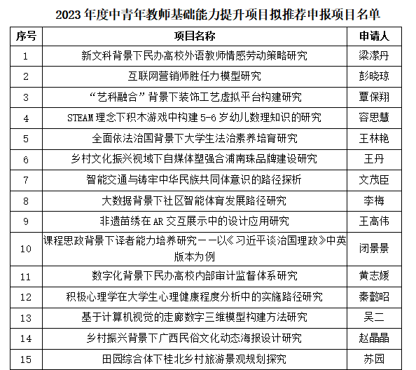 根据《自治区教育厅关于组织申报2023年度广西高校中青年教师科研基础能力提升项目的通知》(桂教科研〔2022〕12号)要求,由项目负责人自主申请,二级单位、部门推荐,经学校组织学术工作委员会委员评审,对项目的创新性、可行性、实用性及推荐材料真实性进行评审,根据限项要求,现将推荐结果公示如下: