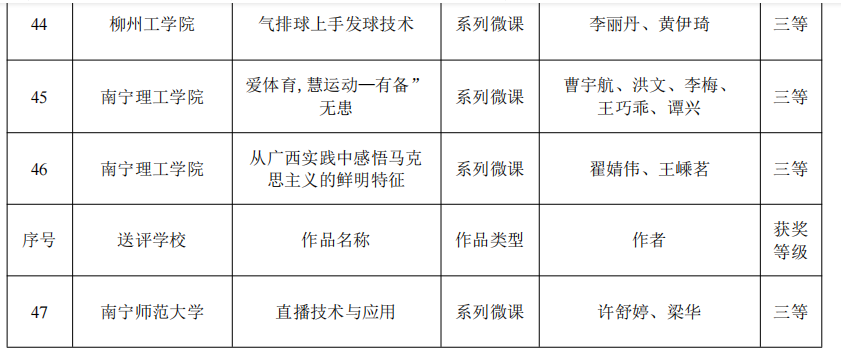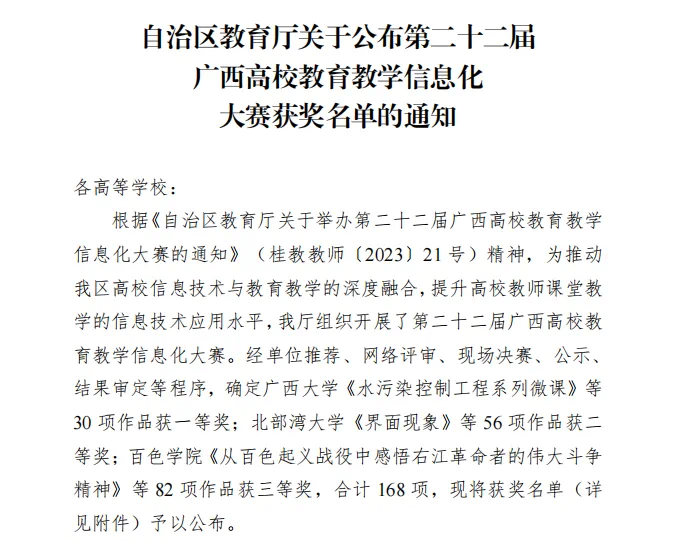 2023年12月6日,自治区教育厅公布了第二十二届广西高校教育教学信息化大赛获奖名单,我校曹宇航教师团队微课《爱体育,慧运动——有备无“患”》、翟婧伟教师团队微课《从广西实践中感悟马克思主义的鲜明特征》获得三等奖。
