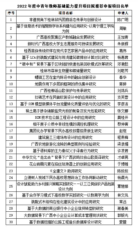 根据《治区教育厅关于组织申报2022年度广西高校中青年教师科研基础能力提升项目的通知》(桂教科研〔2021〕16号)要求,由项目负责人自主申请,二级单位、部门推荐,经学校组织学术工作委员会委员评审,对项目的创新性、可行性、实用性及推荐材料真实性进行评审,根据限项要求,现将推荐结果公示如下: