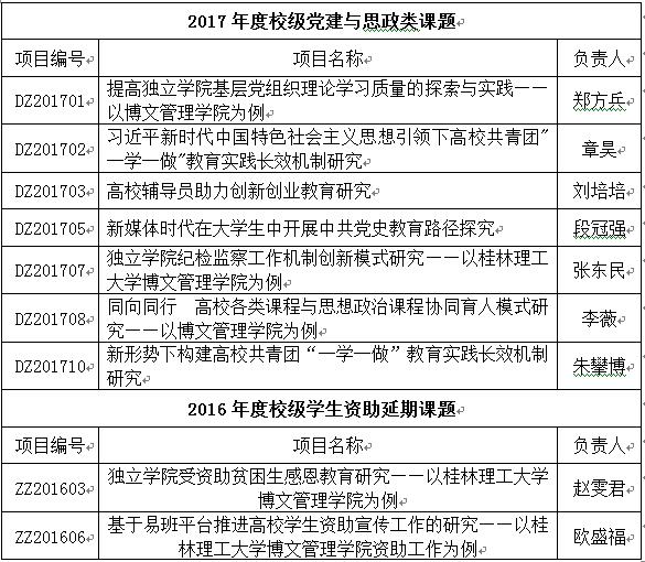 根据《桂林理工大学博文管理学院科研项目管理办法》的要求,我部门将于2019年10月组织2017年度校级党建与思政类课题和2016年度校级学生资助延期课题的结题工作,请各课题负责人按要求填写相关表格、整理相关材料。现将有关事宜通知如下: