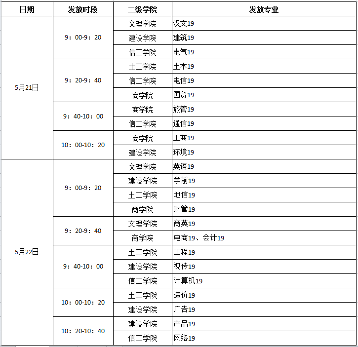 2019级学生教材于2020年5月21日-5月22日在教一楼书库(1116、1117、1118、1119)发放。本次以专业年级为单位发放,请各二级学院配合做好组织工作,并汇总不返校学生名单,于发书前报到教研处。具体时间安排如下: