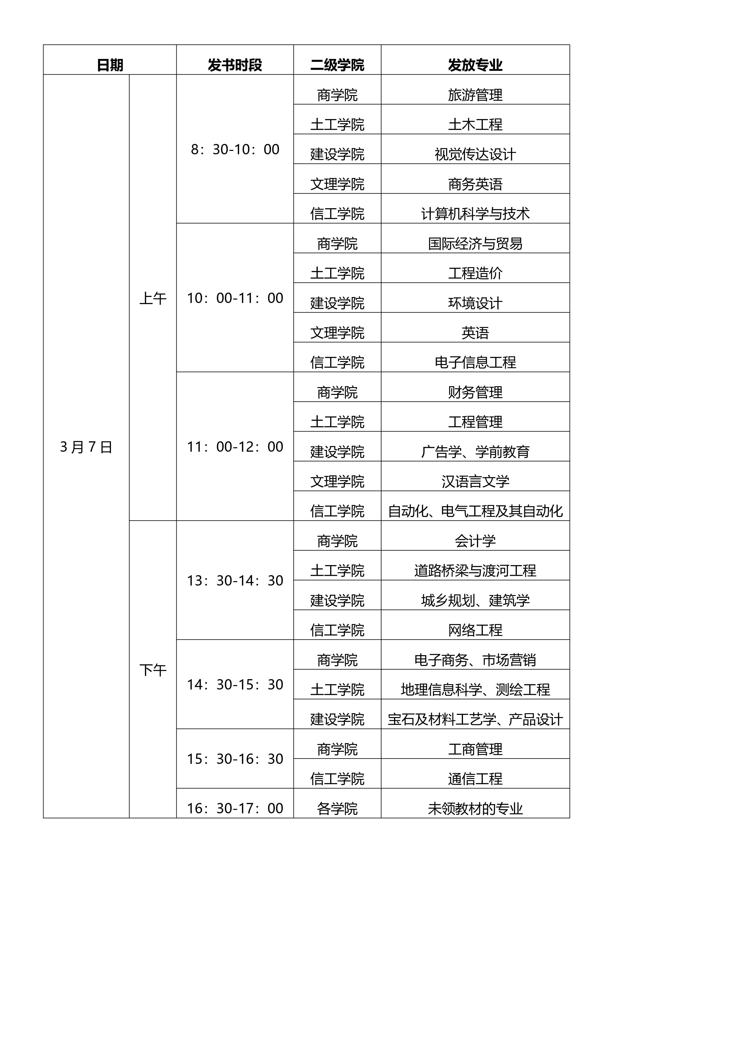 本学期学生教材(含专升本)于2021年3月7日在教一楼书库(1116、1117、1118、1119)发放。本次以专业年级为单位发放,请各学院做好组织工作,通知学生按规定时间领取教材。具体时间安排如下: