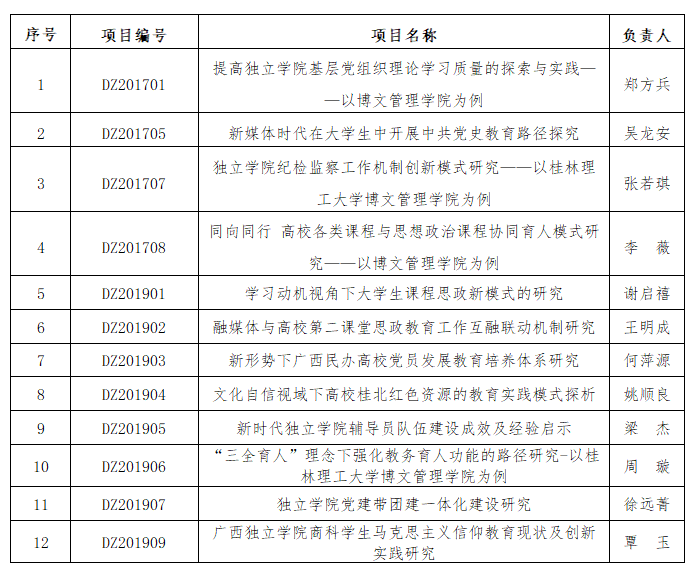 根据《桂林理工大学博文管理学院科研项目管理办法》的要求,我部门将于2020年11月组织2017年、2019年度校级党建与思政类课题延期课题的结题工作,请各课题负责人按要求填写相关表格、整理相关材料。现将有关事宜通知如下:
