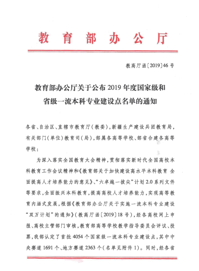 近日,教育部发布了《教育部办公厅关于公布2019年度国家级和省级一流本科专业建设点名单的通知》(教高厅函〔2019〕46号),我校土木工程、建筑学和工程造价等3个专业顺利入选省级一流本科专业建设点。