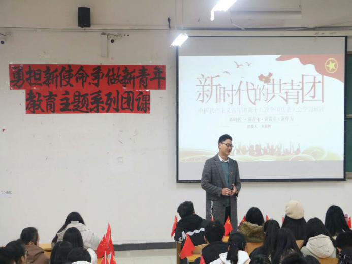 2、我们于12月13日,在4502教室举办“勇担新使命,青年大学习”教育主题系列团课,主讲人是老师,此次主题为“新时代的共青团”。通过此次团课我们更深层次的了解习近平新时代中国特色社会主义思想,老师为我们讲述了国家“站起来”、“富起来”、“强起来”三个阶段,介绍了团十八大的基本概况,强调了共青团的初心和使命。