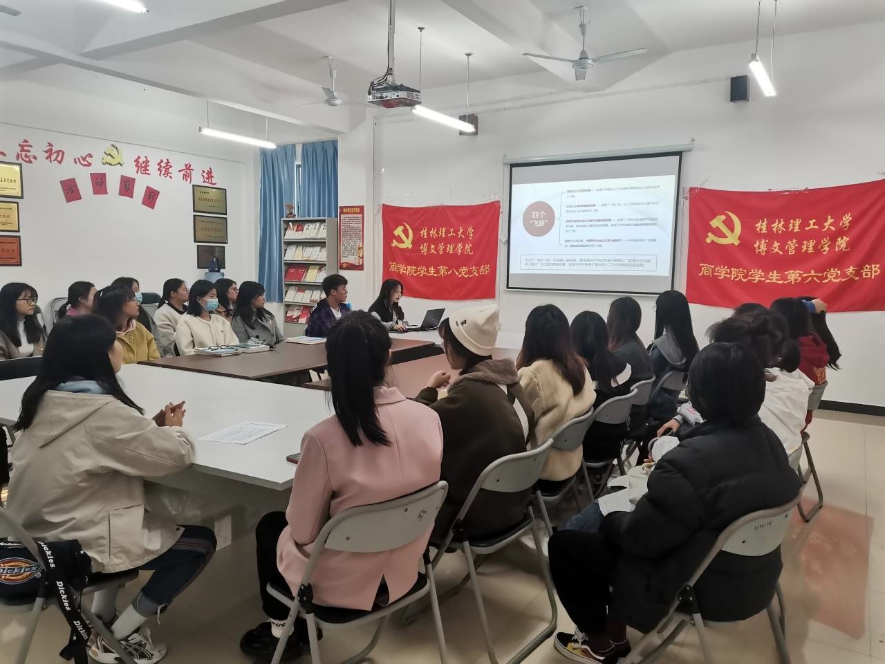 11月19日中午,商学院学生第六党支部、第八党支部在1410共同召开,关于学习中国共产党第十九届中央委员会第六次全体会议重要内容的活动。本次会议由六支部书记孟继志同志主持,支部全体党员、预备党员参加。