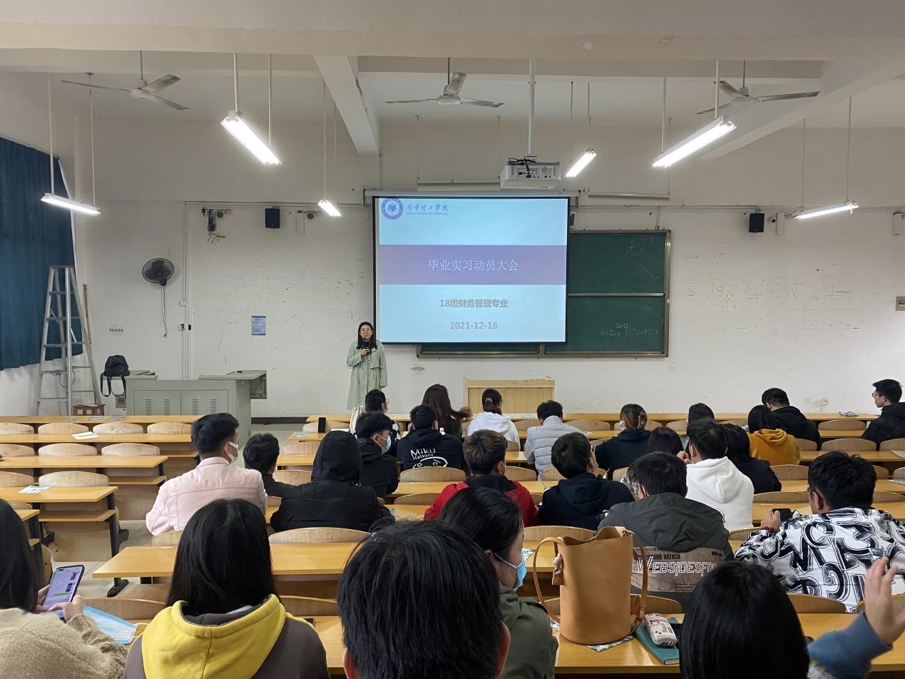 为了让同学们更加顺利的完成毕业实习(第一批)的任务,2021年12月16日,商学院财管教研室在4501教室召开了18级财务管理专业毕业实习动员大会。担任本次动员大会的主讲人为陈俊老师。