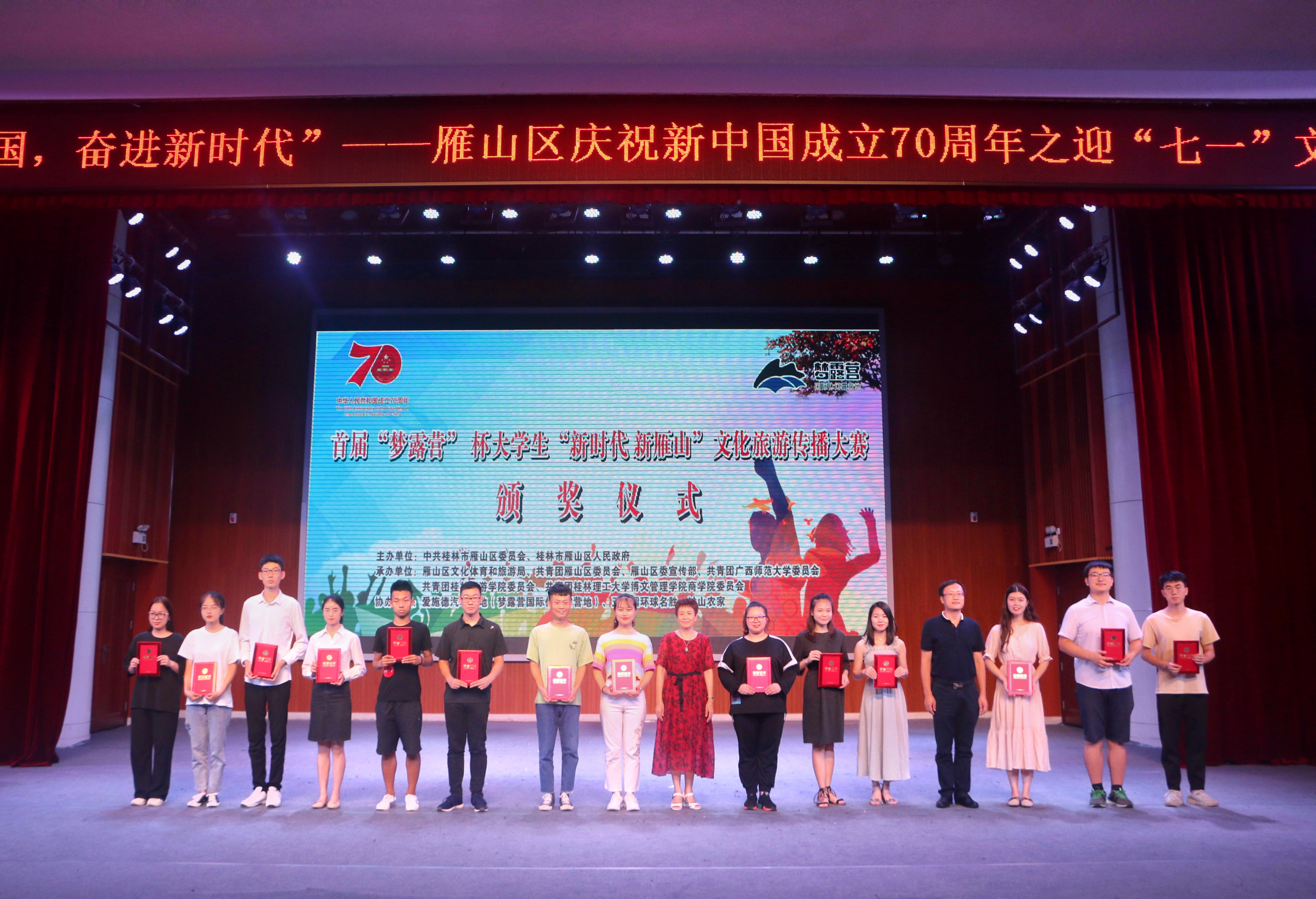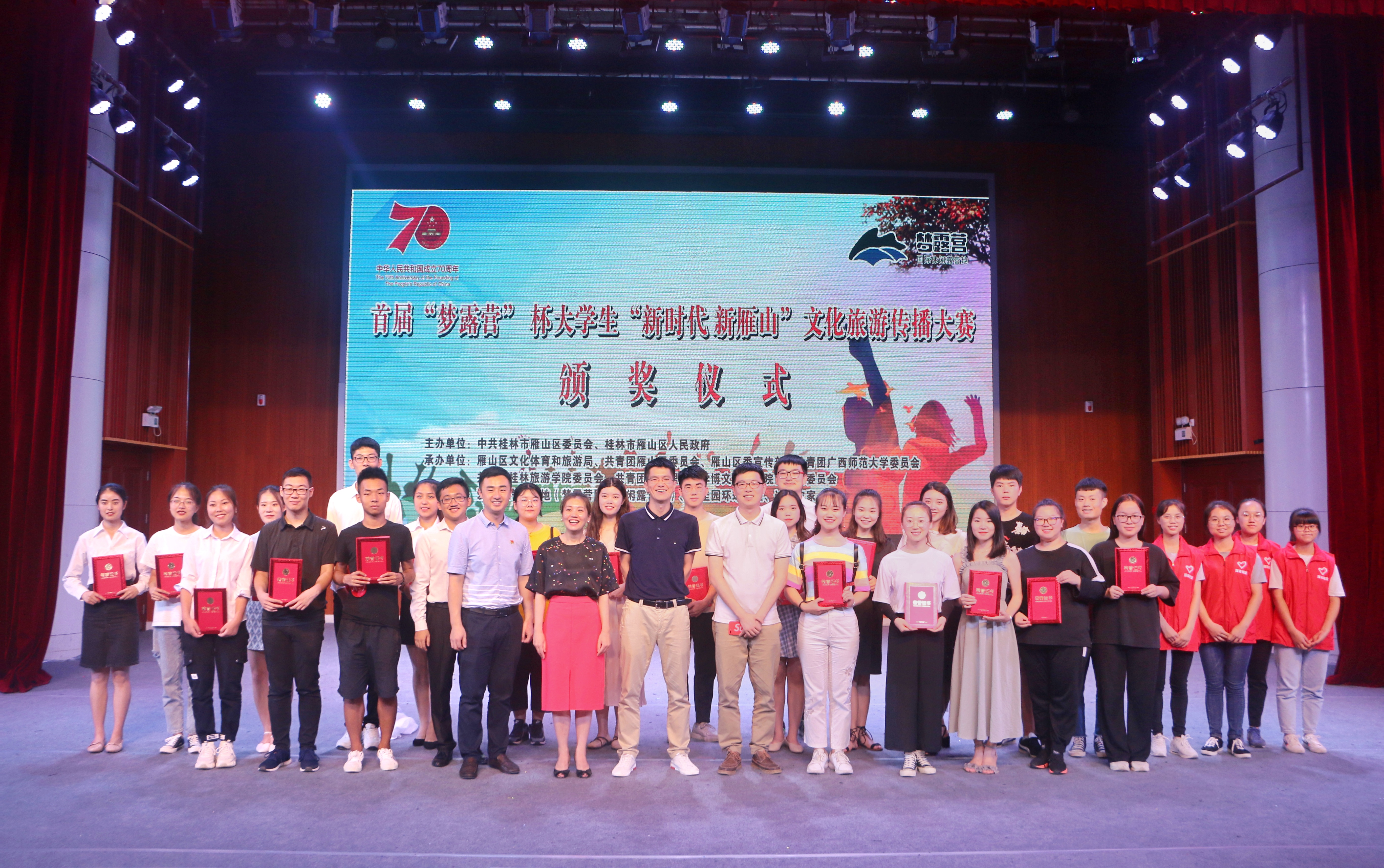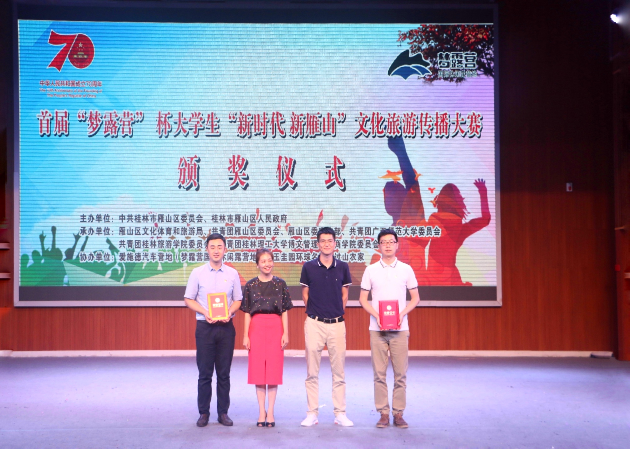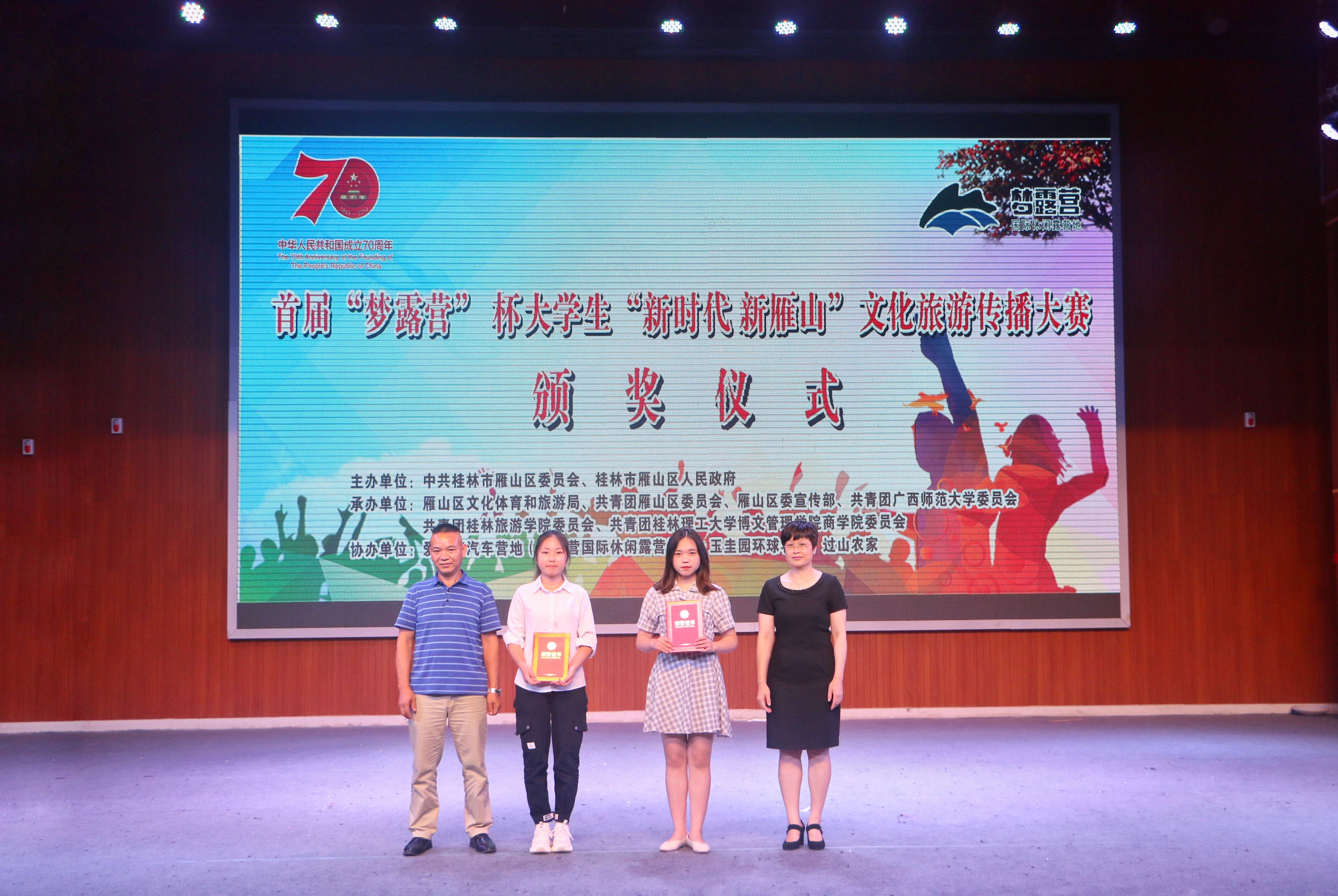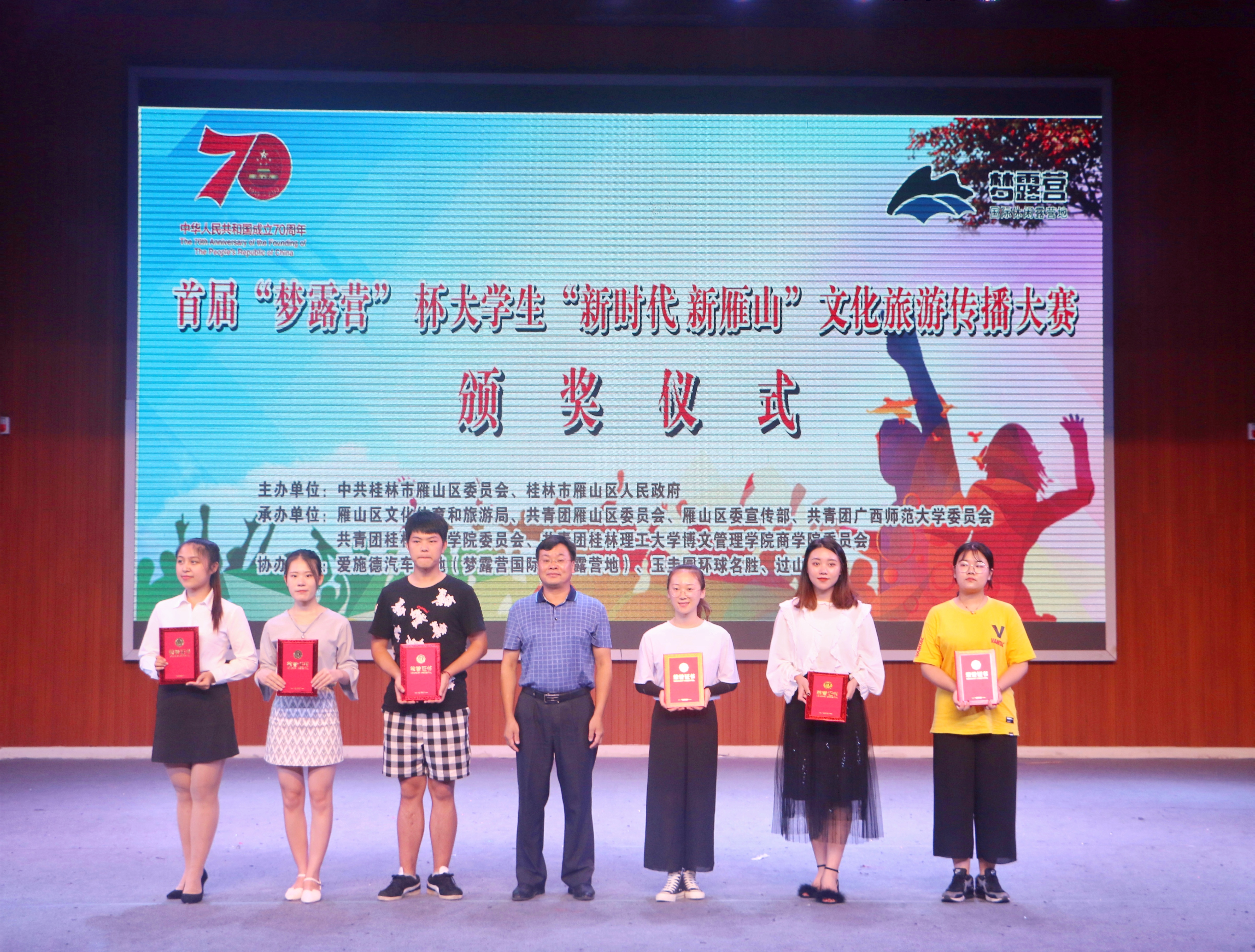 6月21日,雁山区首届“梦露营杯”大学生“新时代,新雁山”文化旅游传播大赛颁奖典礼在广西师范大学进行。出席本次颁奖典礼的嘉宾有:雁山区政府副区长李红、雁山区委常委组织部部长、雁山区人大副主任张杰雄等六位雁山区领导。商学院在历经一个多月的比赛中表现突出,成绩优异,共有一名老师和十名选手获得奖项。