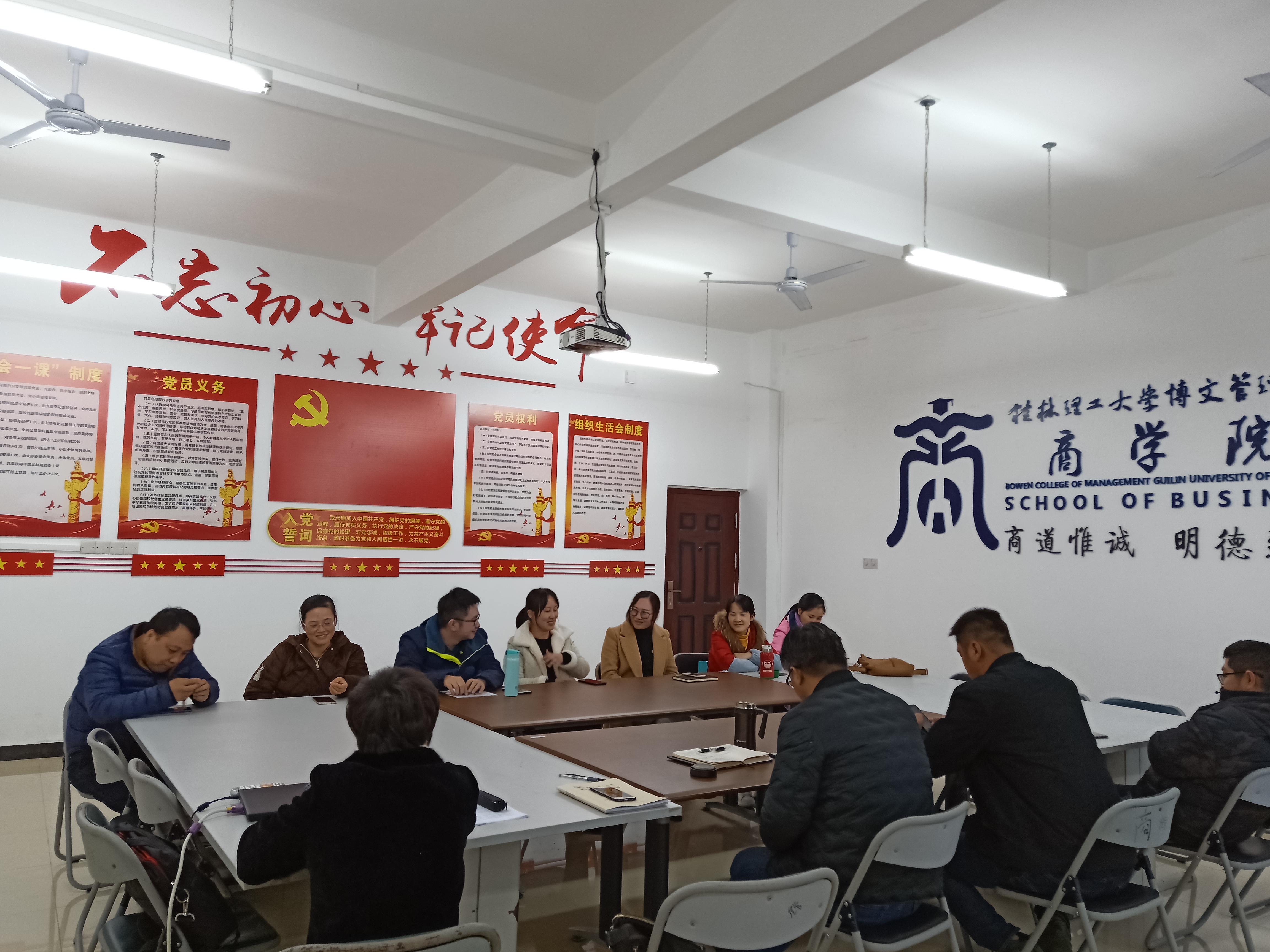 首先,教工支部委员同志就教工支部2019年度学习及工作开展情况进行了总结。在上级党组织的关心和指导下,在各位党员同志的支持和共同努力下,教工支部保质保量的完成了各项工作,通过坚持学习党的各种文件,教职工党员的理论水平和服务意识大幅提高。坚持不断地学习,坚定了意志,更好的激发同志们的工作积极性和主动性,勇于承担大事和难事,为更好的开展教学活动,奠定了坚实的基础,也取得了不少成绩。商学院党总支书记同志对教工支部在2019年开展的工作和取得的成绩给予了肯定和表扬。