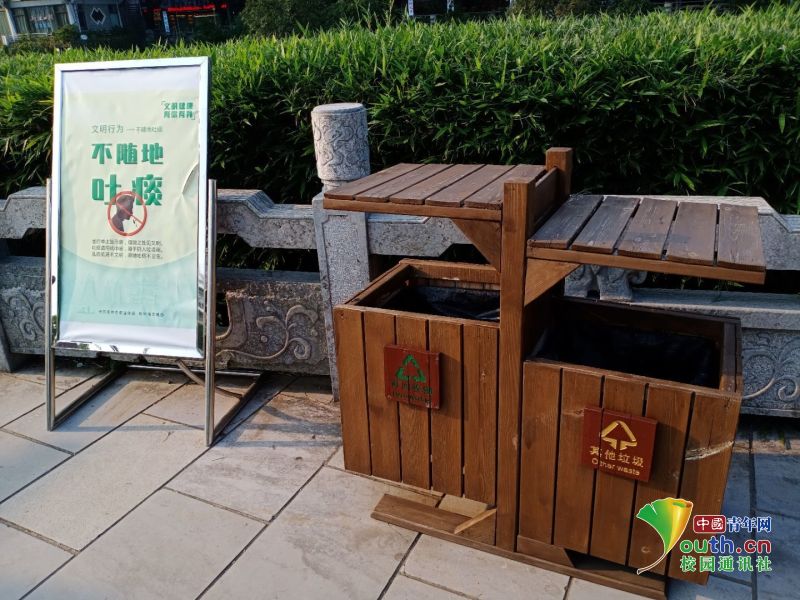 图为景区设置的文明提示标语以及垃圾丢弃木桶