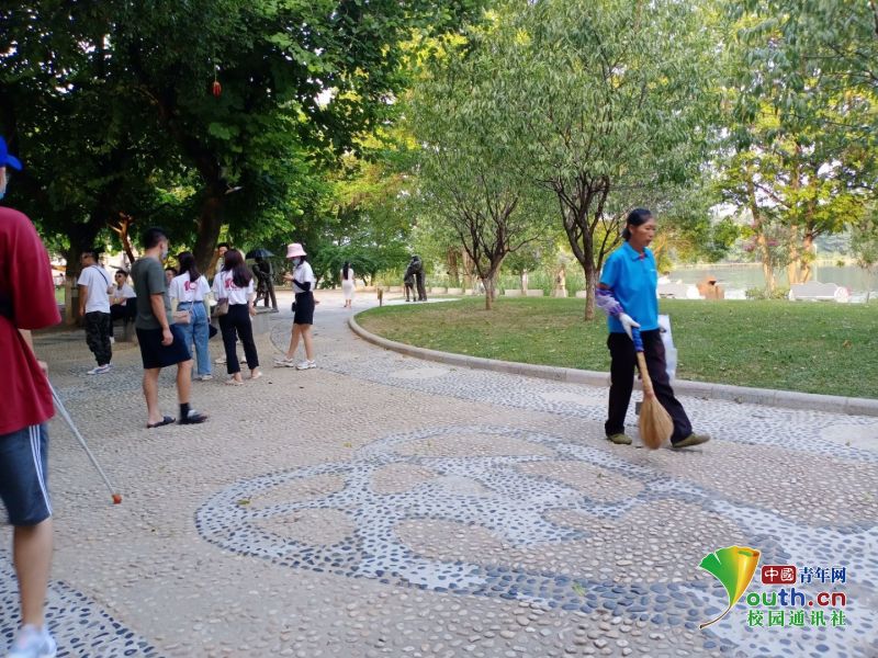 图为景区清洁人员在清扫地面,游客们很少会随地丢弃垃圾