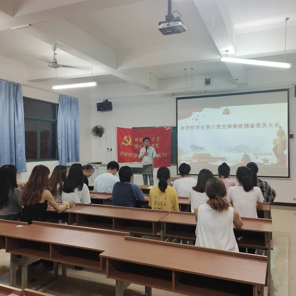 2021年6月24日晚上,为落实发展对象接收为预备党员的工作,商学院学生第六党支部在1414会议室召开接收预备党员大会。此次会议由孟继志书记主持,支部全体党员、预备党员和发展对象参加。