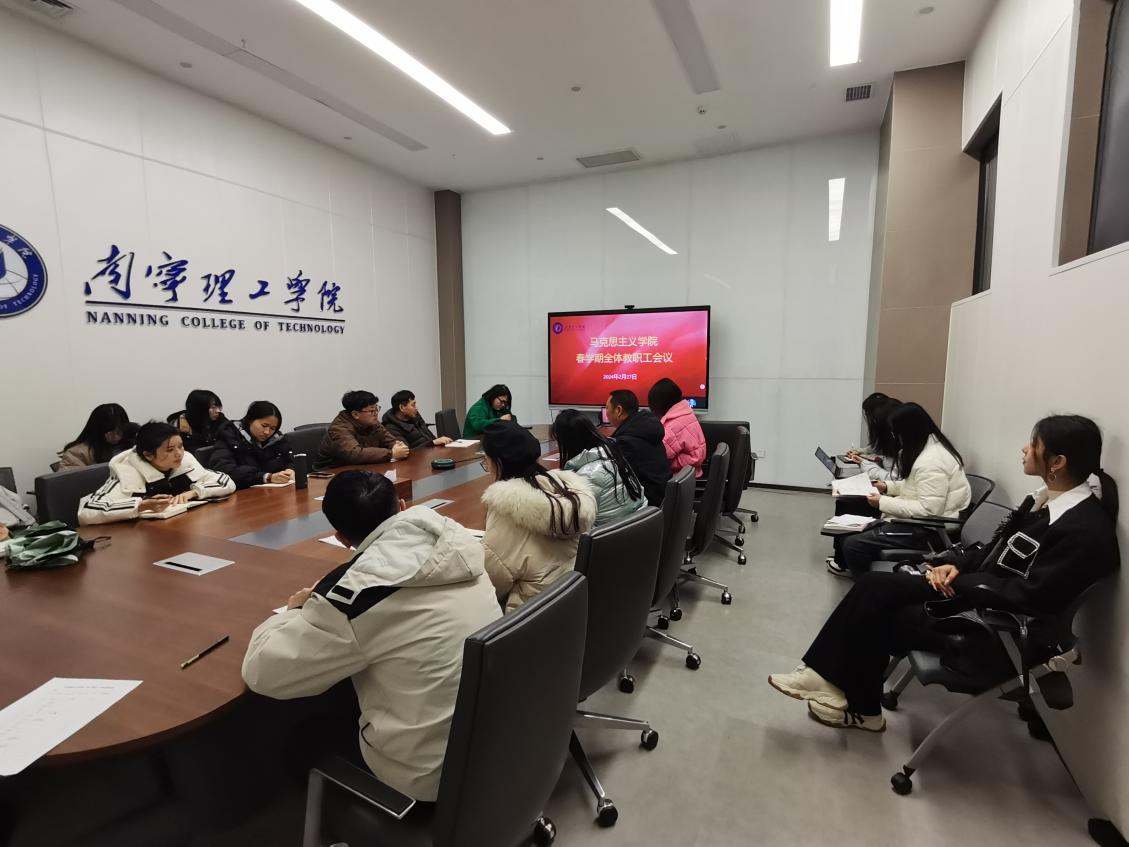 为部署和推动学院新学期各项工作的顺利开展,2月27日上午九点,马克思主义学院同时在桂林校区3423会议室和南宁校区图书馆617会议室召开新学期全体教职工大会,思想政治理论课教研室主任王明成主持会议。