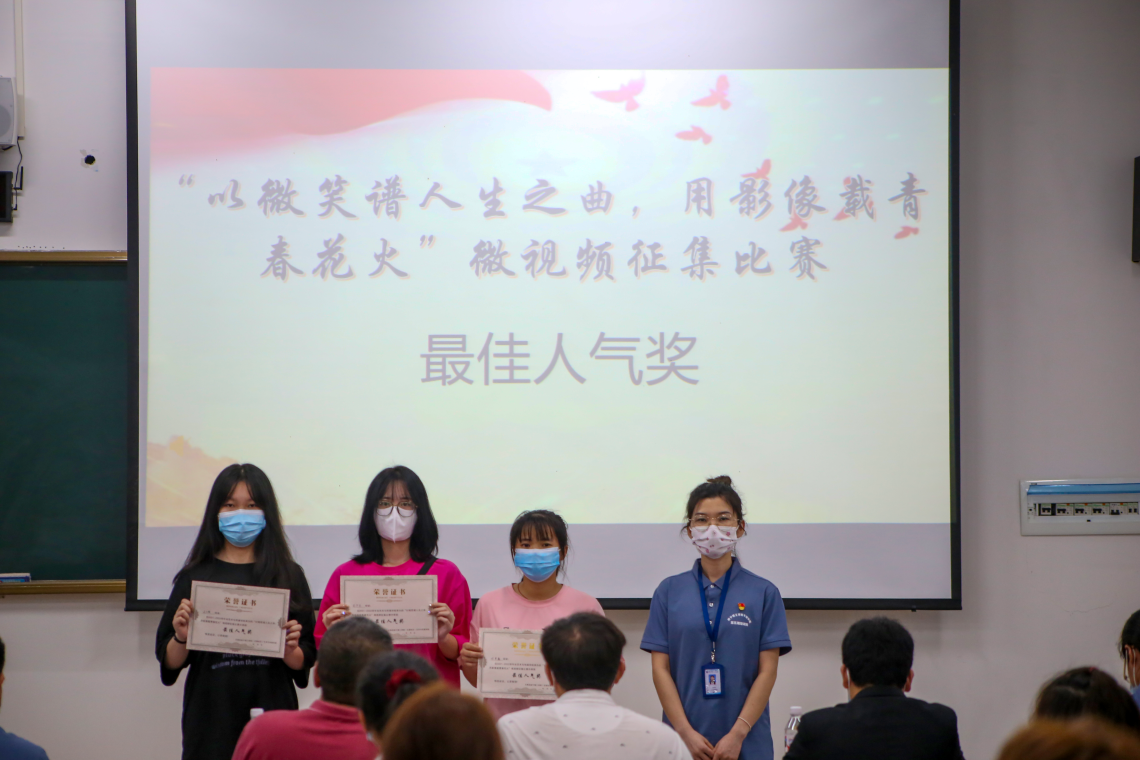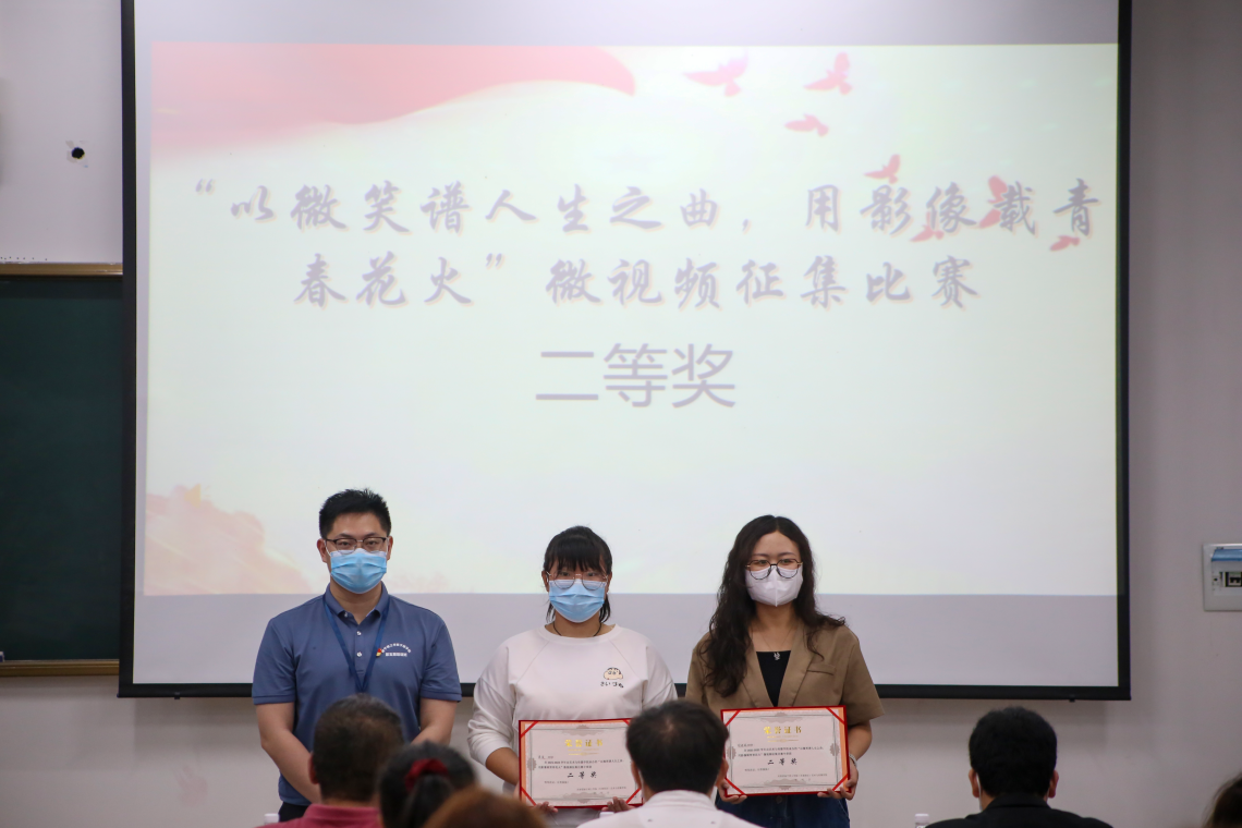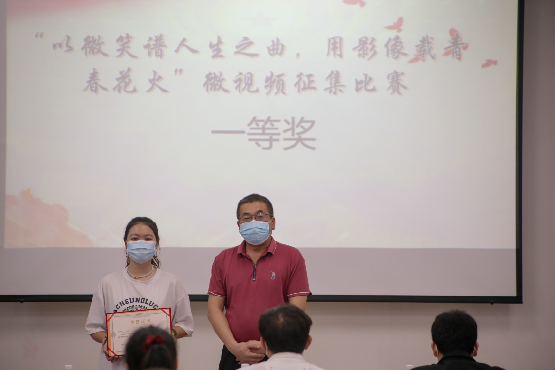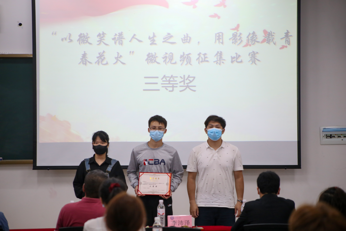 参赛选手展示完自己的作品后,评委老师进行统一评分。最终,艺术与传媒学院“以微笑谱人生之曲,用影像载青春之花火”为主题的微视频征集比赛的获奖情况如下:获得一等奖的是幸钰莲;获得二等奖的是郝桂林、梁宸;获得三等奖的是周珊珊、李发辉。随后,评委老师给获奖同学颁发获奖证书以及奖品并合影留念。