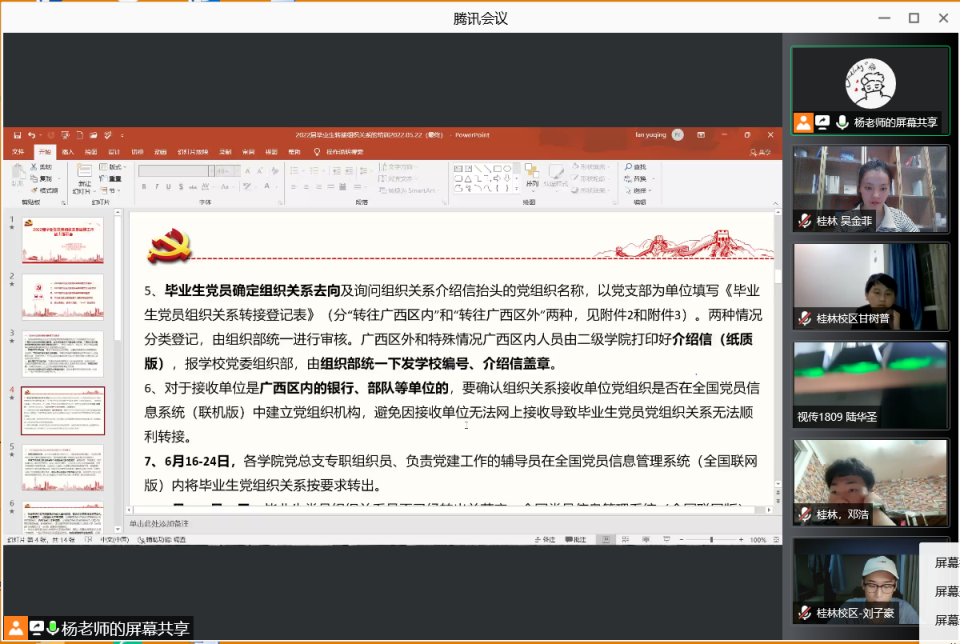 为顺利开展毕业生党员组织关系转接工作,我院于 5月28日晚上20:30通过线上会议的方式组织召开了毕业生党员组织关系转接线上培训会、“同心促就业,携手共向前”就业帮扶动员会,由学院党建负责人杨正益主持会议,桂林校区和东盟校区全体毕业生党员参会。本次党会旨为加强所有毕业生党员“不忘初心,砥砺前行”,不断学习党的理论知识,提高党性修养,丰富学识,进取投身实践。希望广大毕业生党员们早日在各自的岗位上建功立业,成为社会栋梁,实现梦想,以实际行动回报社会。