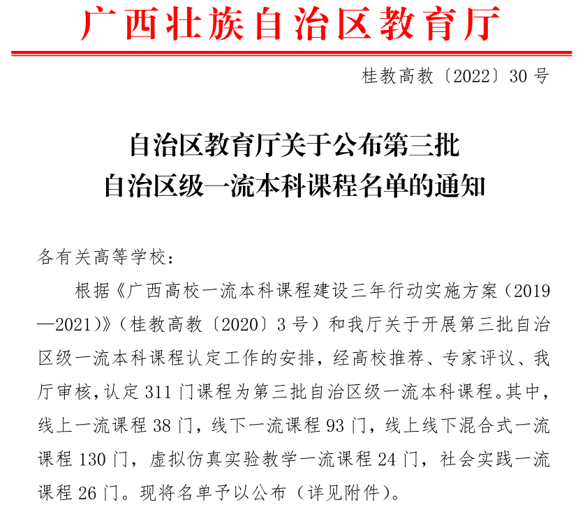 近日,自治区教育厅发布《关于公布第三批自治区级一流本科课程名单的通知》,我校《土木工程施工技术与组织》被认定为区级线下一流本科课程,《网络营销社会实践》被认定为区级社会实践一流本科课程。