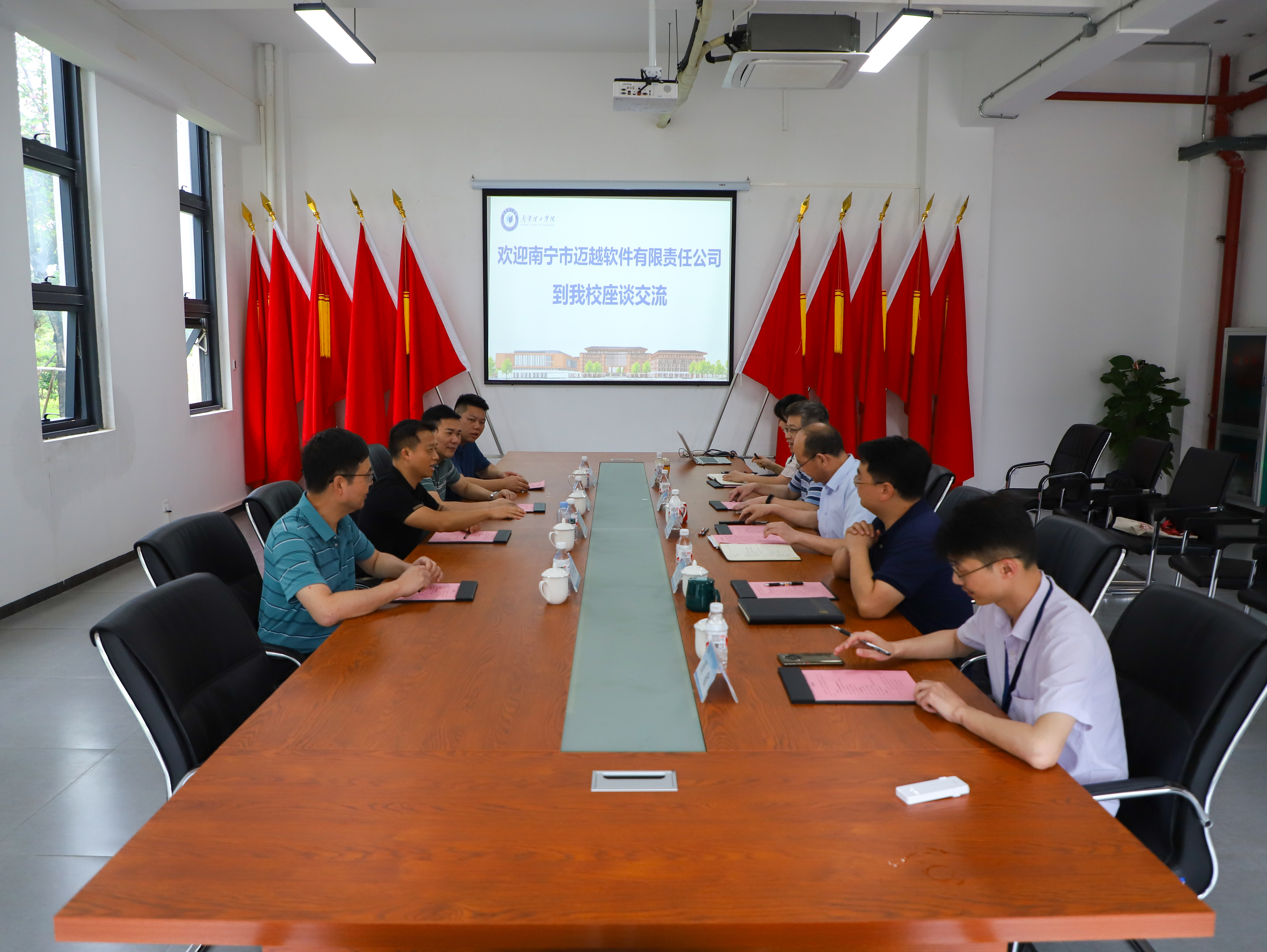 6月14日下午,南宁市迈越软件有限责任公司董事长李常青一行到我校东盟校区交流。校长王金叶、副校长冯正垚,相关二级学院和职能部门负责人待来访一行并举行座谈交流会。
