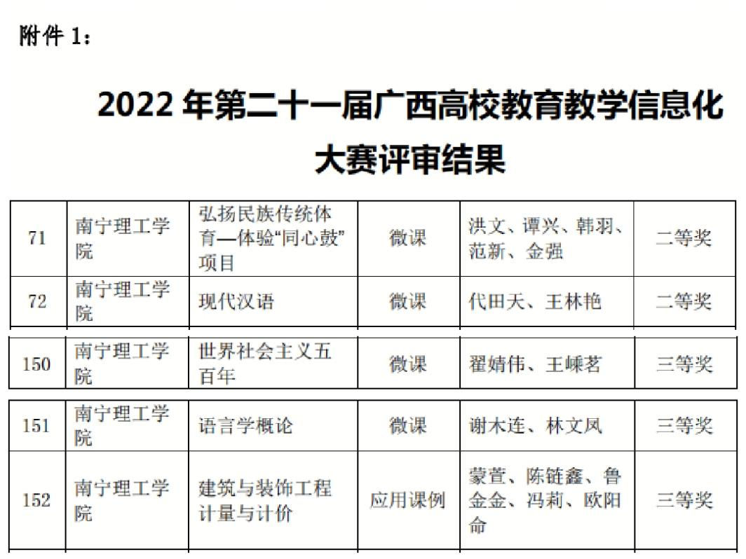近日,由自治区教育厅、广西高等教育学会高校教育技术专业委员会联合举办的第二十一届广西高校教育教学信息化大赛圆满落下帷幕。经过激烈角逐,我校荣获二等奖2项,三等奖3项,在获奖等次和获奖数量上都有所突破,取得有史以来最好成绩!