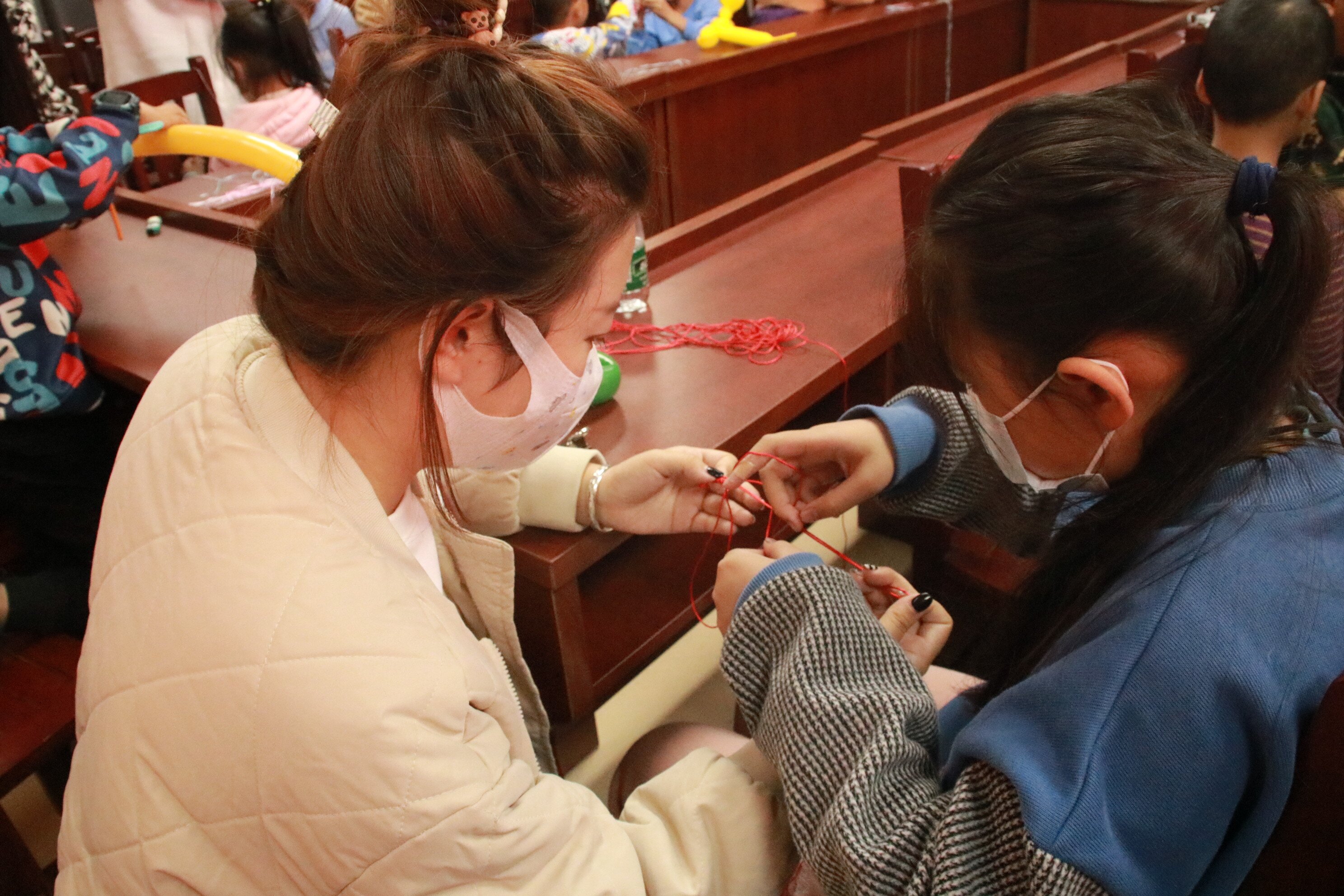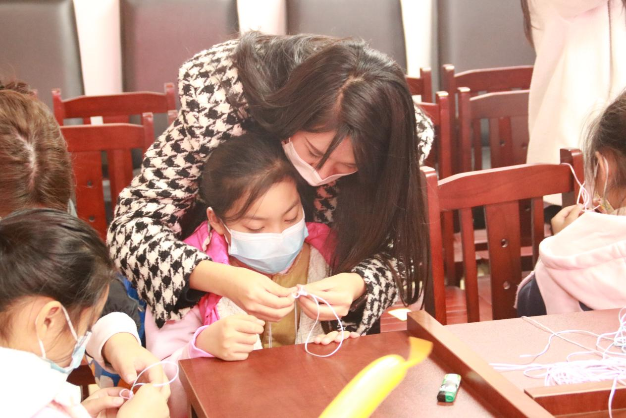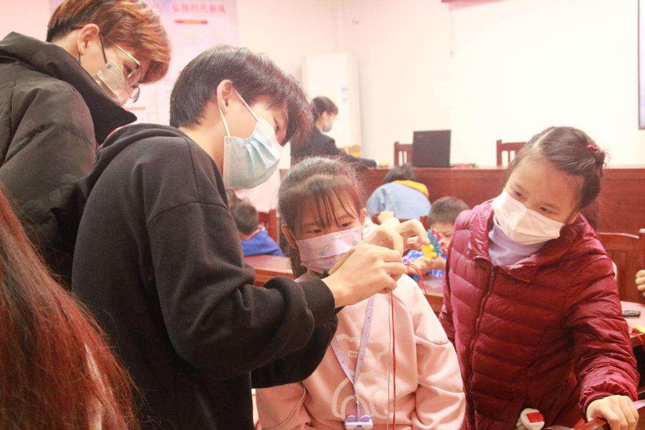 渡头社区青少年活动室,欢声笑语,热闹非凡,接下来党支部成员们正在教授小朋友们手工编织,“右手拿着绳不动,左手绳子朝下穿过”一位学生党员正在细心教学,正是通过以“编”促学,以“玩”促思的方式来增进青少年儿童学习趣味性。
