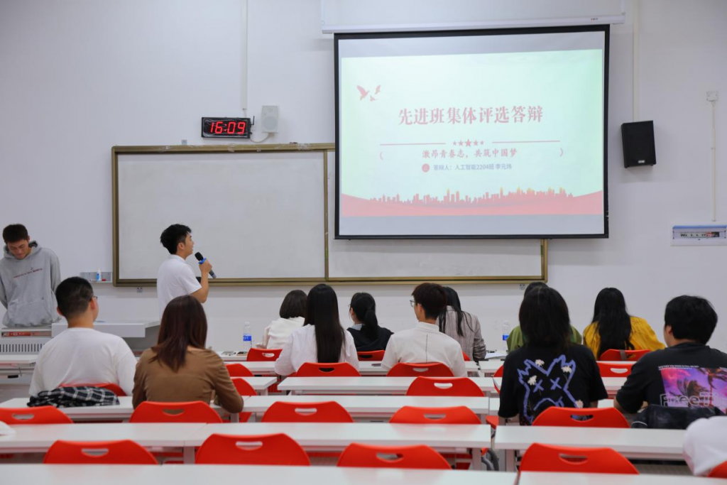 伊始,由主持人宣读会议流程和评审要求,随后,人民政府奖学金候选人、申请“五四”红旗团支部、先进班集体代表依次上台,以PPT宣讲的形式从学习成果,学生工作,社会实践等各方面详细陈述在大一学年中的个人及集体情况,评委们通过候选人和各班代表的PPT宣讲内容和实际事迹,最终拟推荐梁曦月等三人为2023—2024学年度自治区人民政府奖学金候选人选,评审出网络与新媒体2202团支部为“五四”红旗团支部,人工智能2204班为先进班集体。