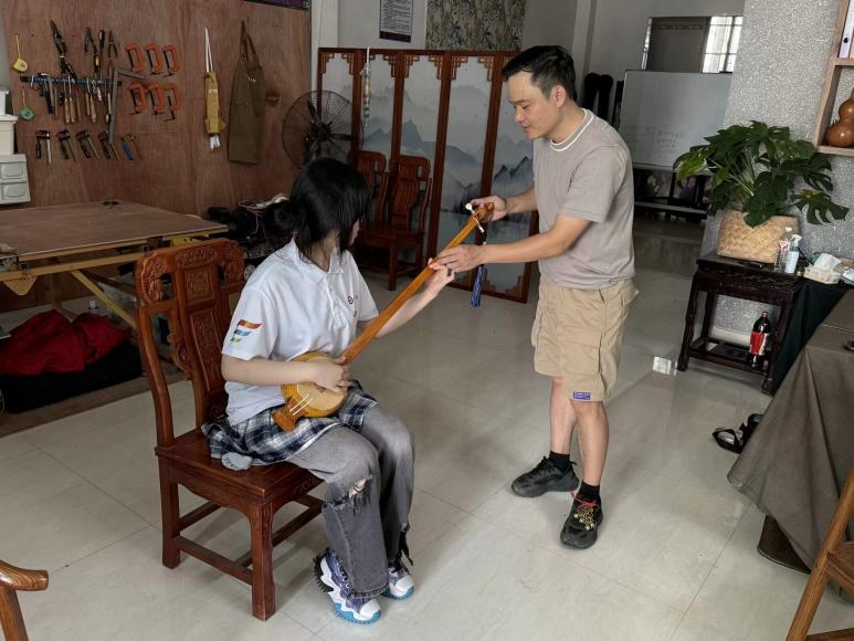 在朱老师的耐心教导下,实践团成员尝试使用天琴弹奏歌曲《小星星》,充分感受到壮族天琴弹唱的独特文化魅力。